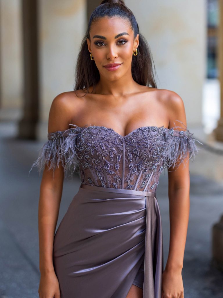 Abito lungo da cerimonia in tessuto raso e paillettes