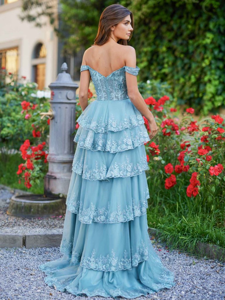 Abito lungo da cerimonia in tessuto raso e pizzo