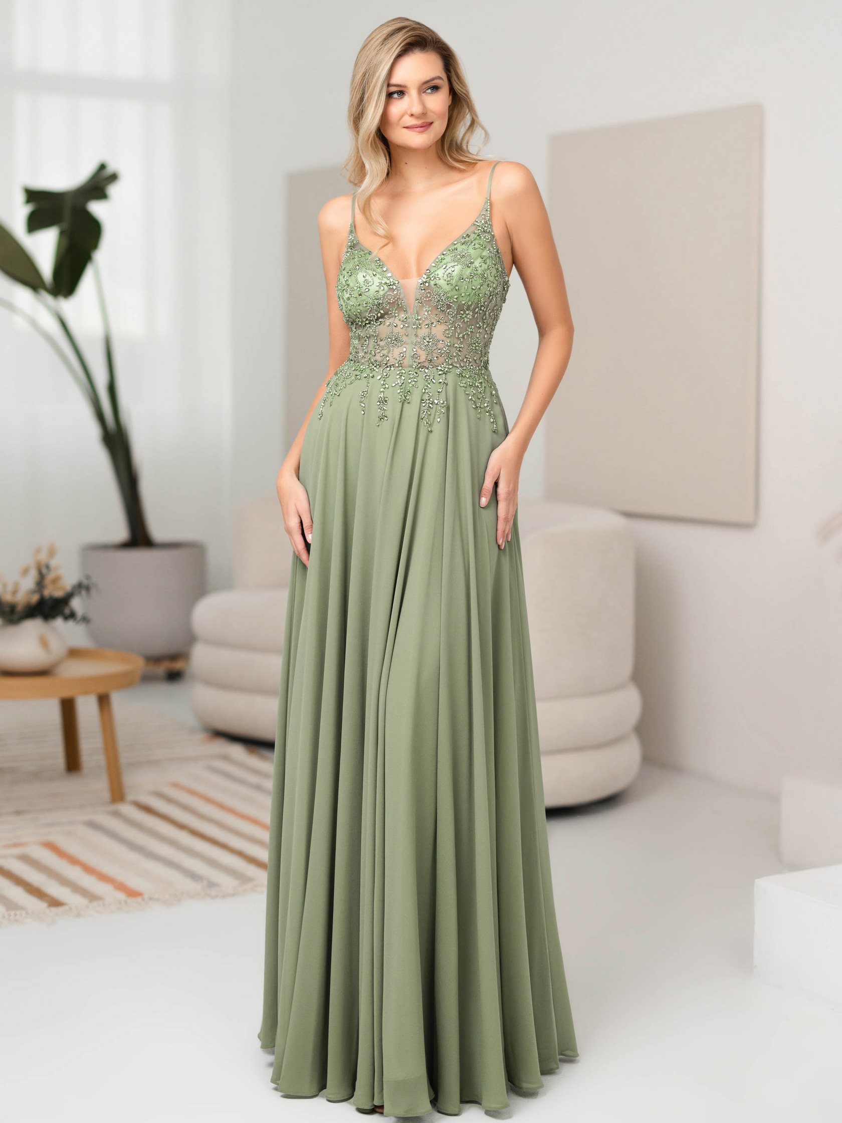 Abito lungo da cerimonia in tessuto toulle e ricamo