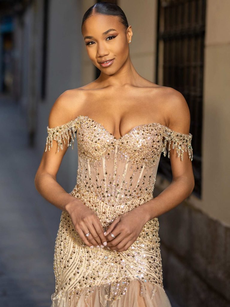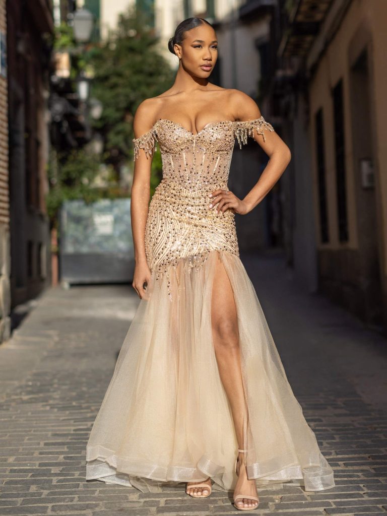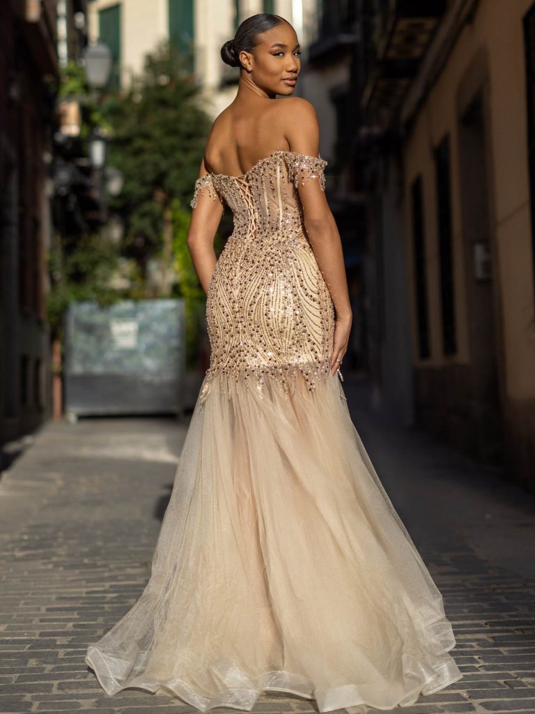 Abito lungo da cerimonia in tessuto organza e paillettes