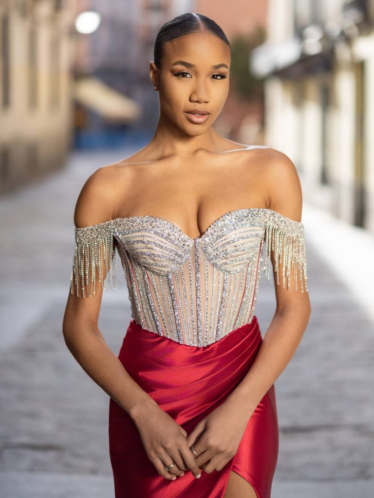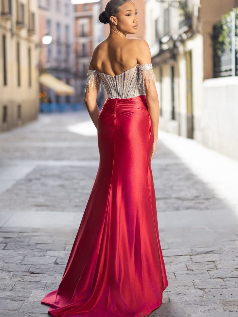 Abito lungo da cerimonia in tessuto raso e paillettes