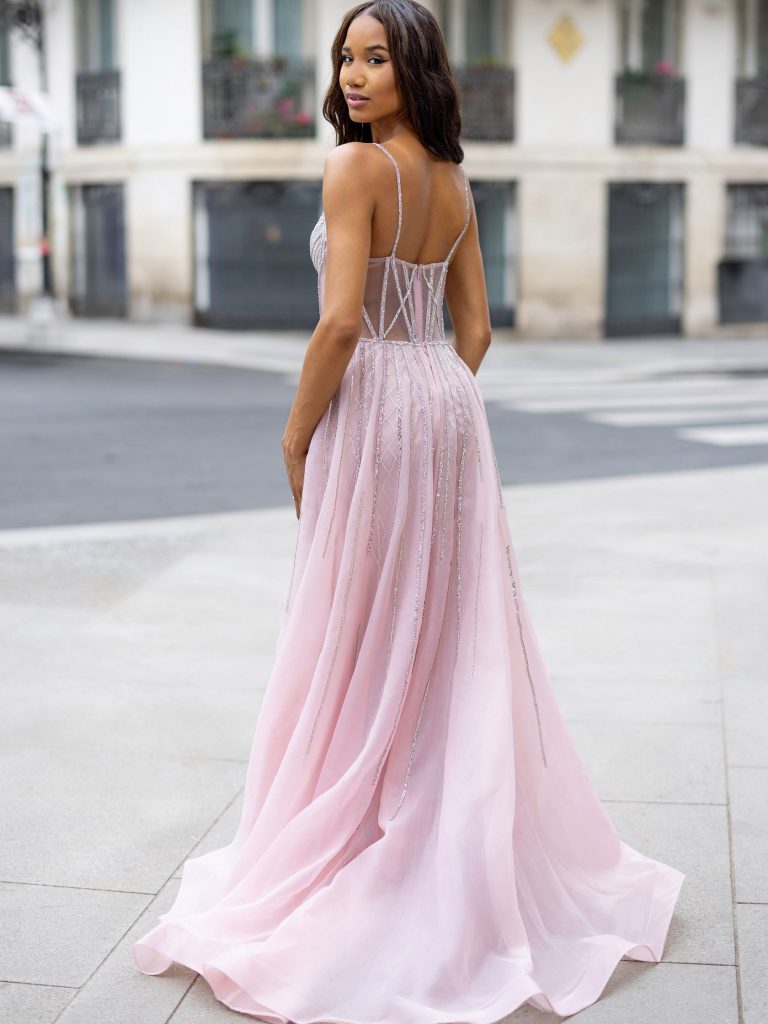 Abito lungo da cerimonia in tessuto organza e paillettes