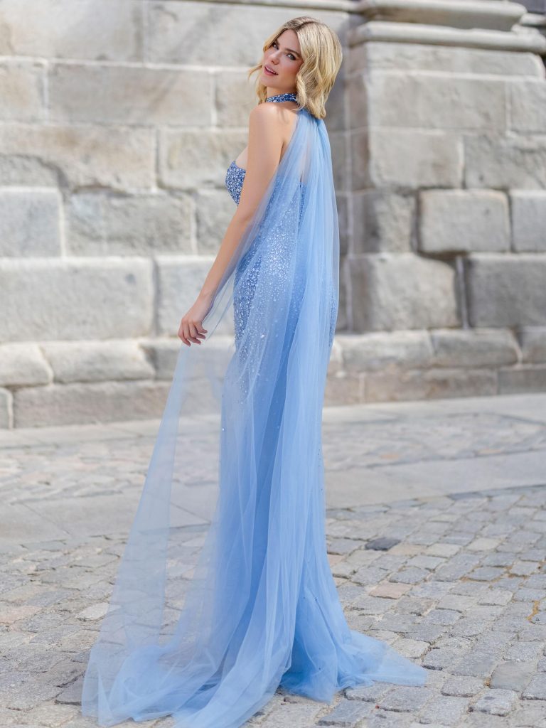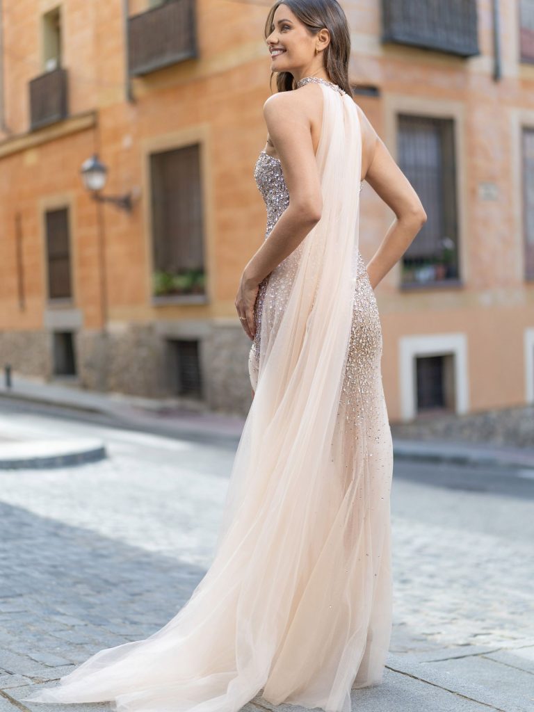 Abito lungo da cerimonia in tessuto organza e paillettes