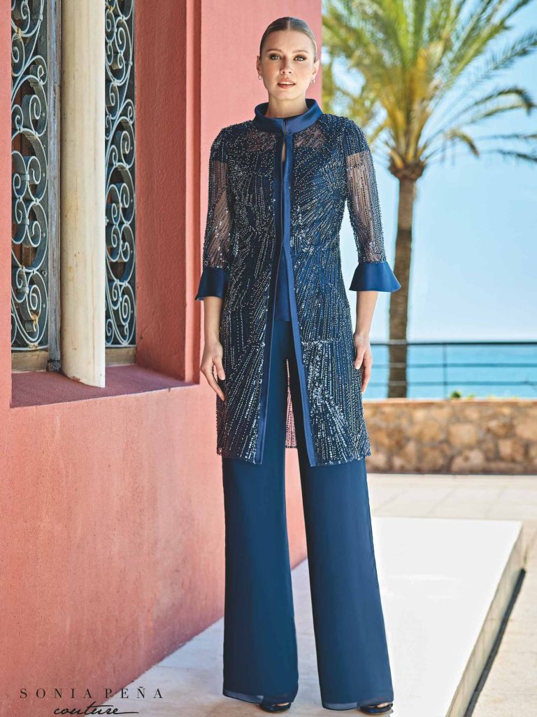 Completo pantalone da cerimonia in tessuto crepe e pizzo