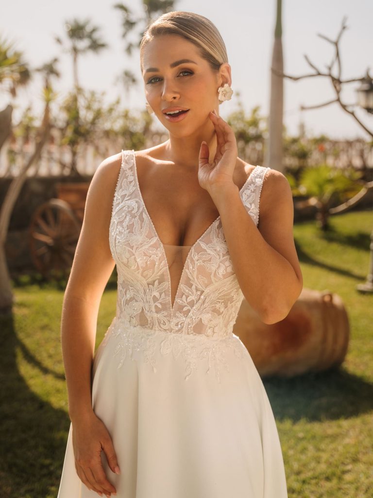 Abito da sposa manica canotta, stile scivolato, scollatura spalle aperta e tessuto organza