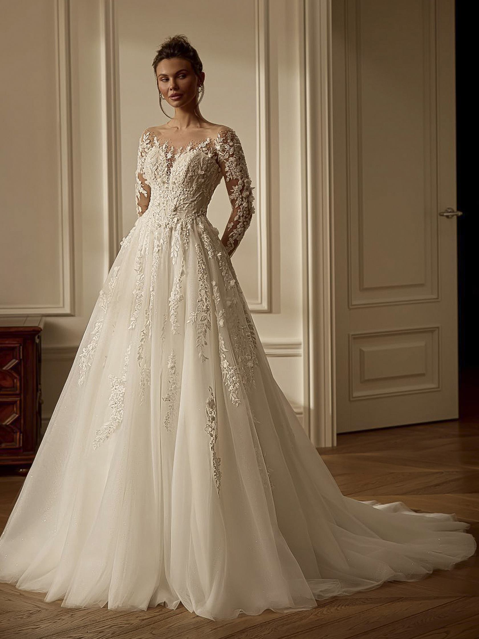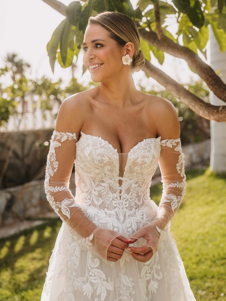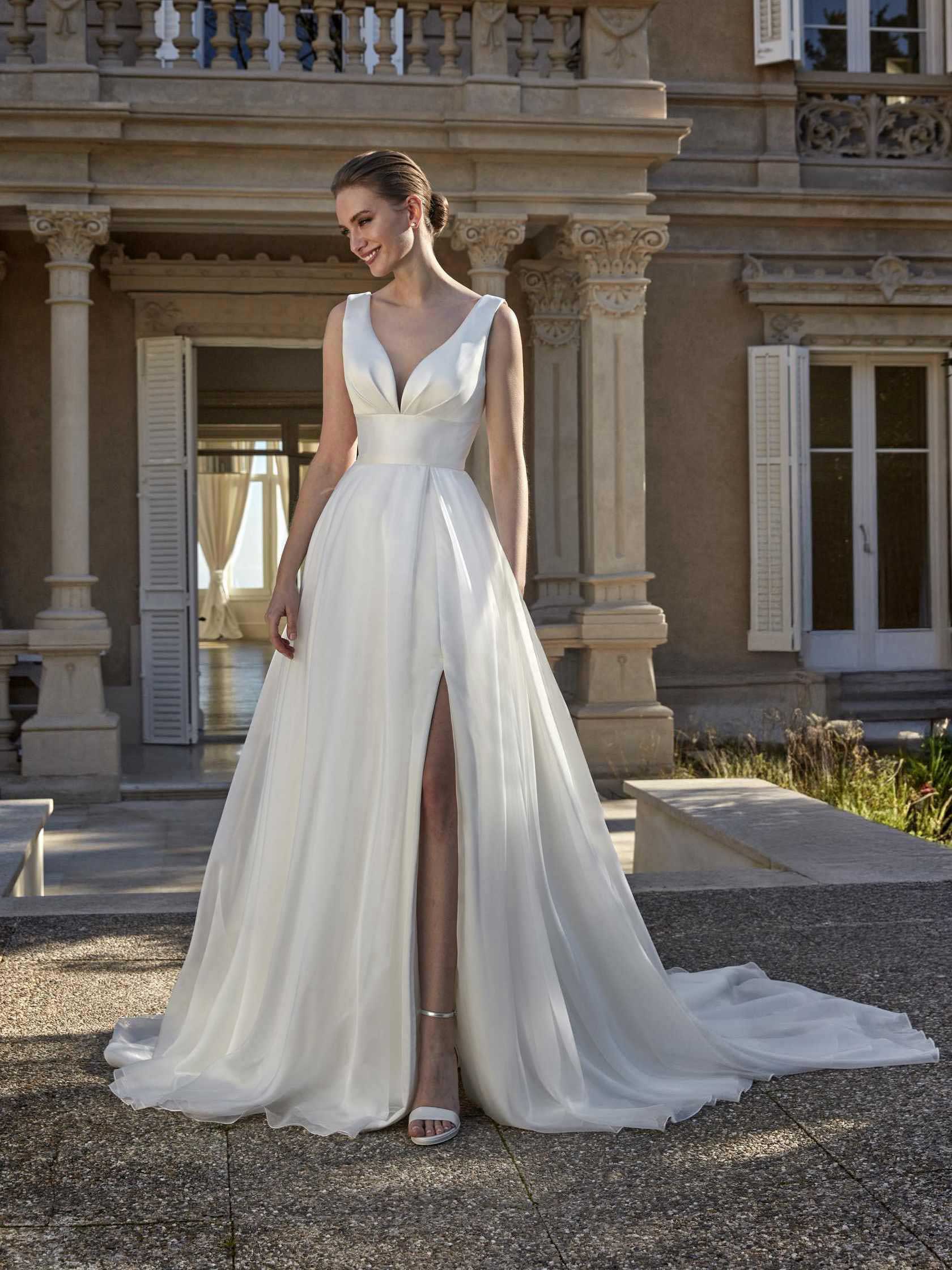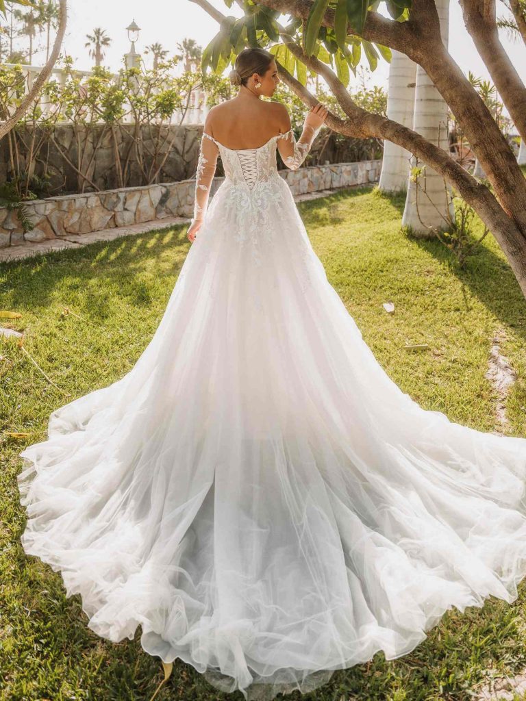 Abito da sposa manica decolte, stile principessa, scollatura spalle aperta e tessuto organza