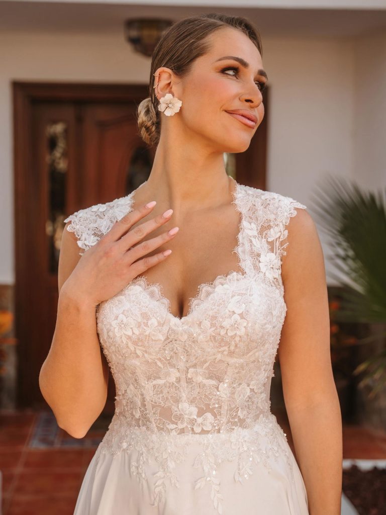 Abito da sposa maniche lunghe, stile scivolato, scollatura spalle velata e tessuto organza