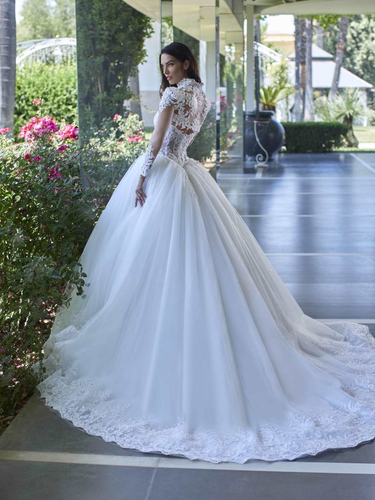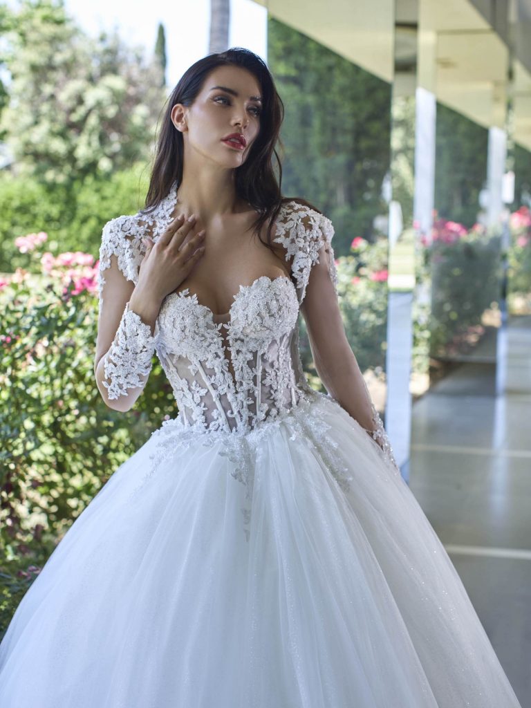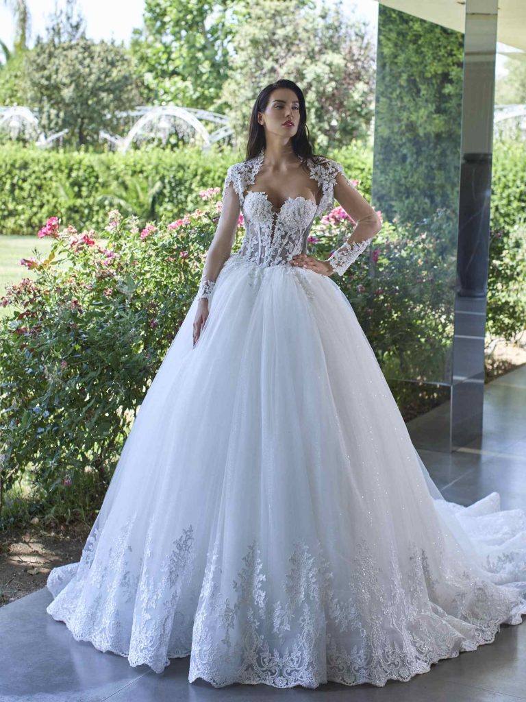 Abito da sposa maniche lunghe, stile principessa, scollatura spalle coperta e tessuto organza