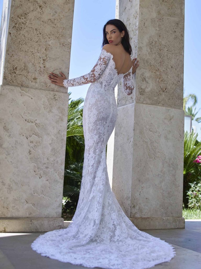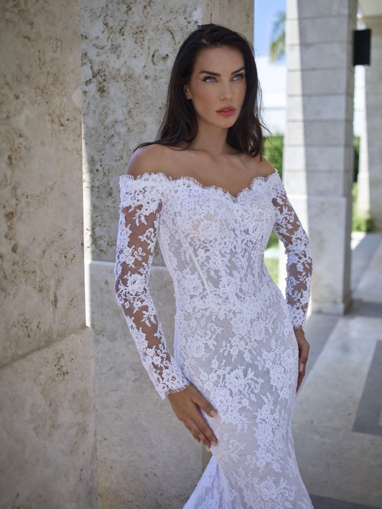 Abito da sposa maniche lunghe, stile sirena, scollatura spalle aperta e tessuto pizzo