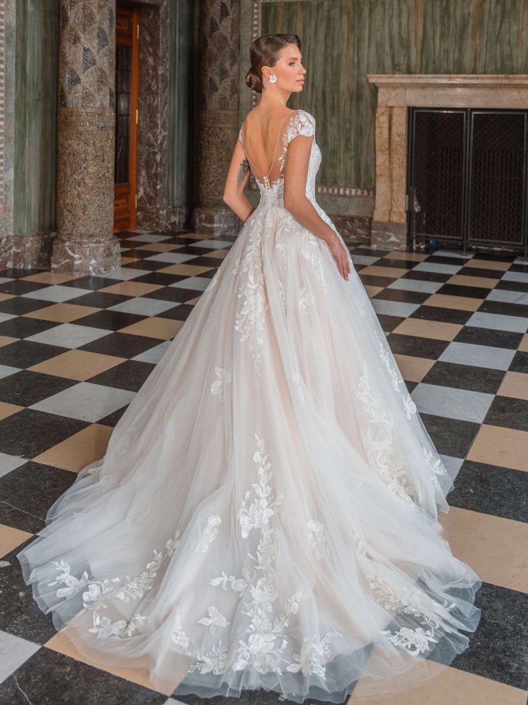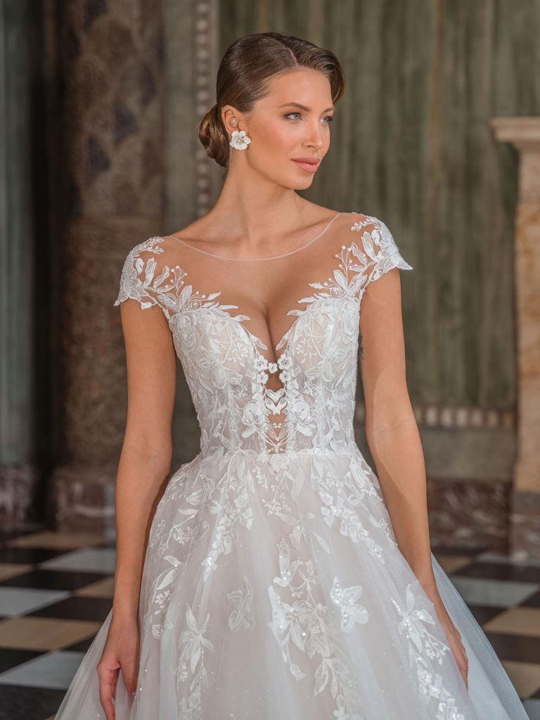 Abito da sposa maniche corte, stile principessa, scollatura spalle aperta e tessuto organza