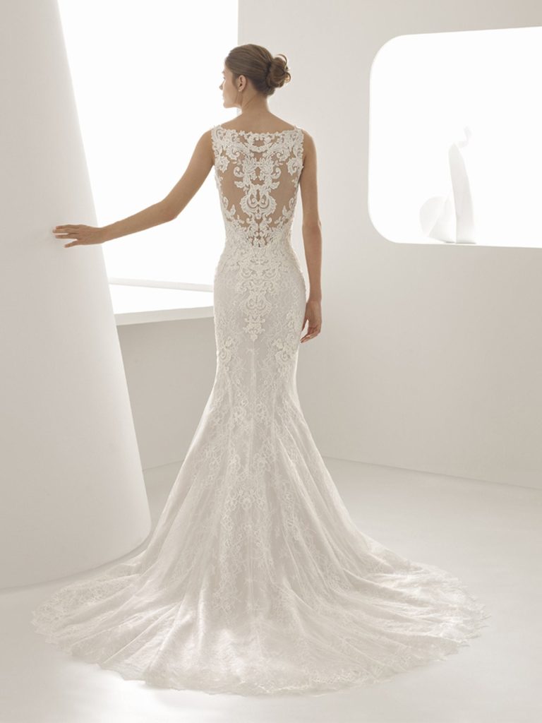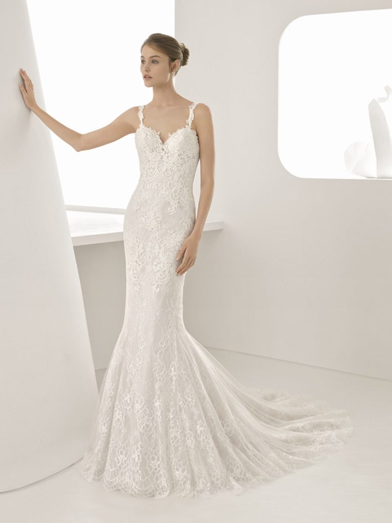 Abito da sposa bretelle, stile sirena, scollatura spalle effetto tattoo e tessuto pizzo