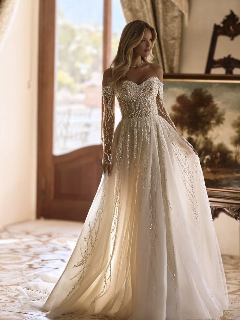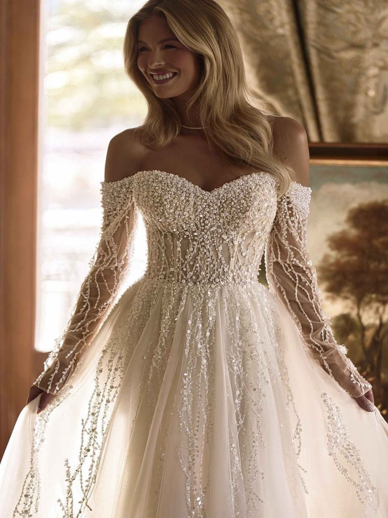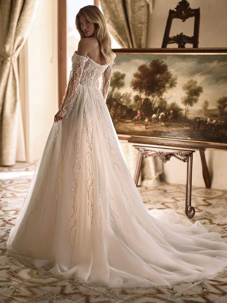 Abito da sposa maniche lunghe, stile principessa, scollatura spalle aperta e tessuto organza