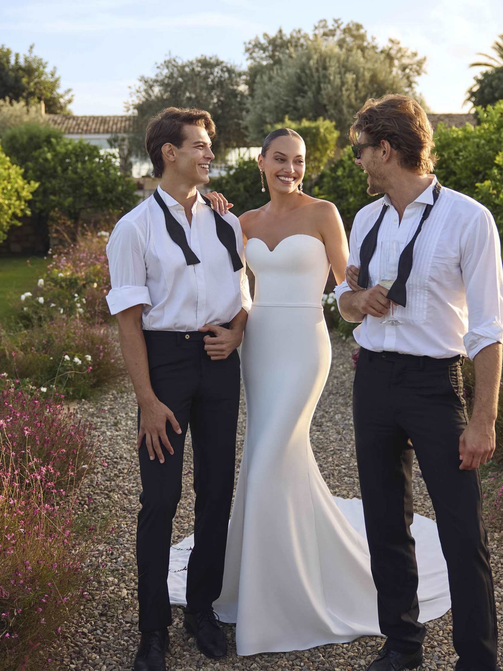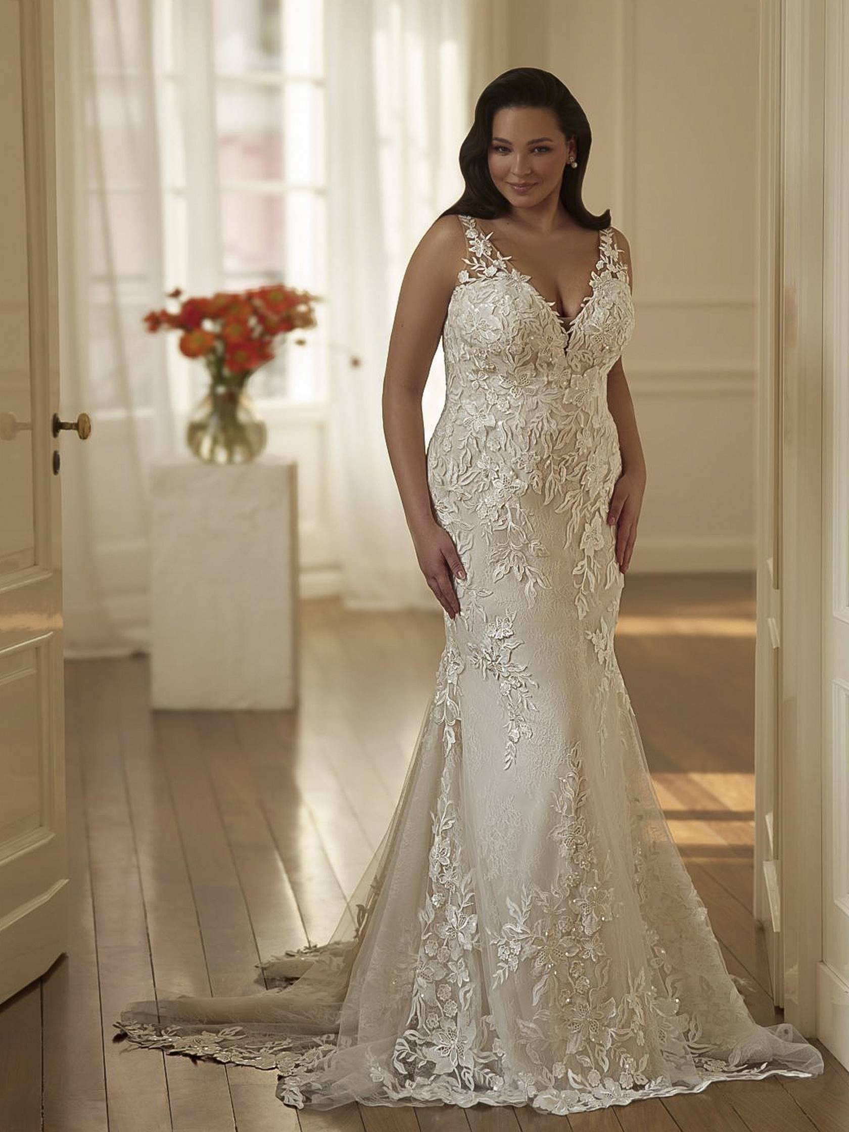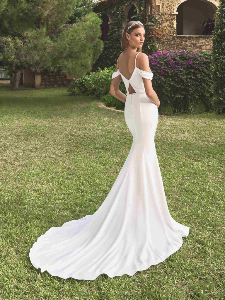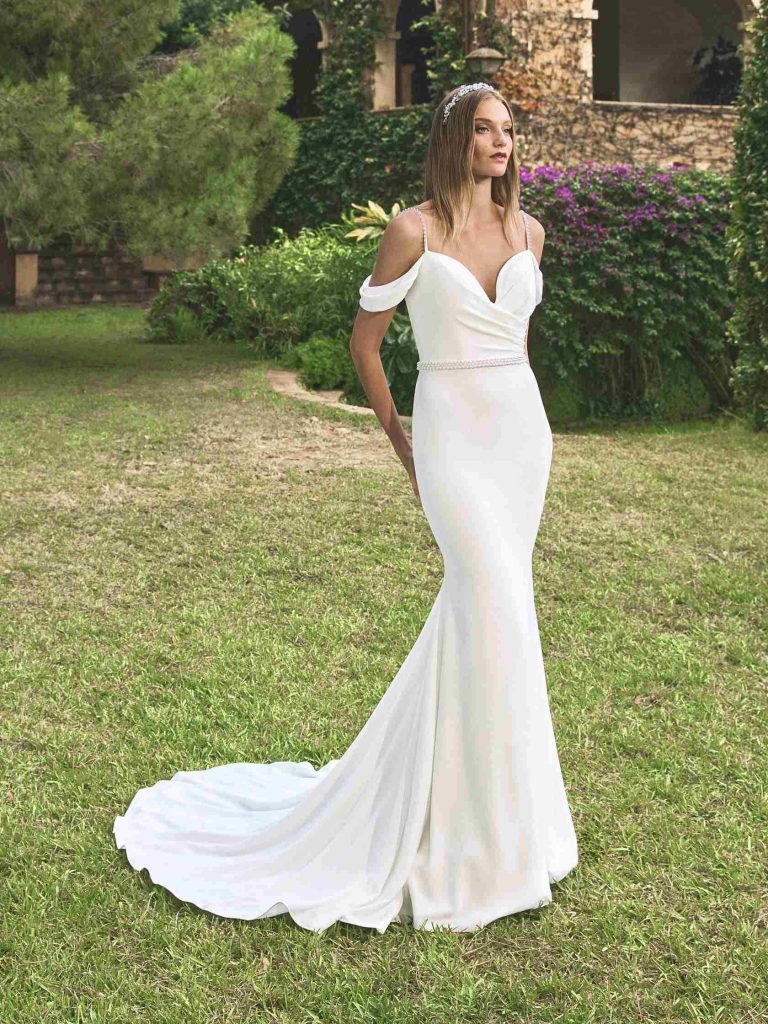 Abito da sposa manica decolte, stile sirena, scollatura spalle aperta e tessuto satin