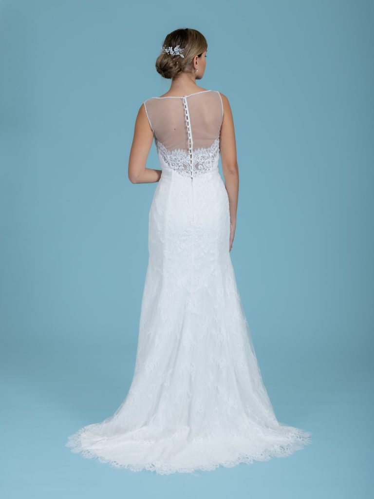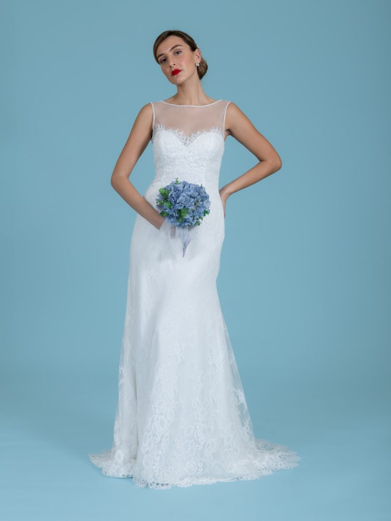 Abito da sposa canotta, stile scivolato, scollatura spalle velata e tessuto pizzo