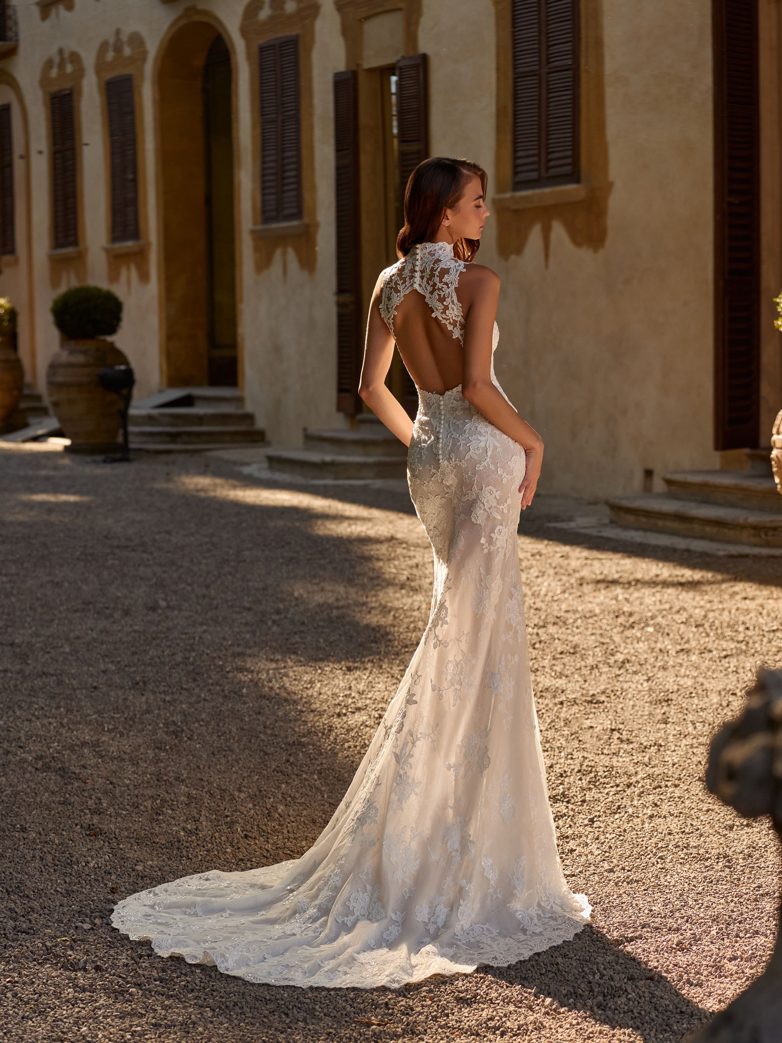 Abito da sposa manica decolte, stile sirena, scollatura spalle a goccia e tessuto pizzo
