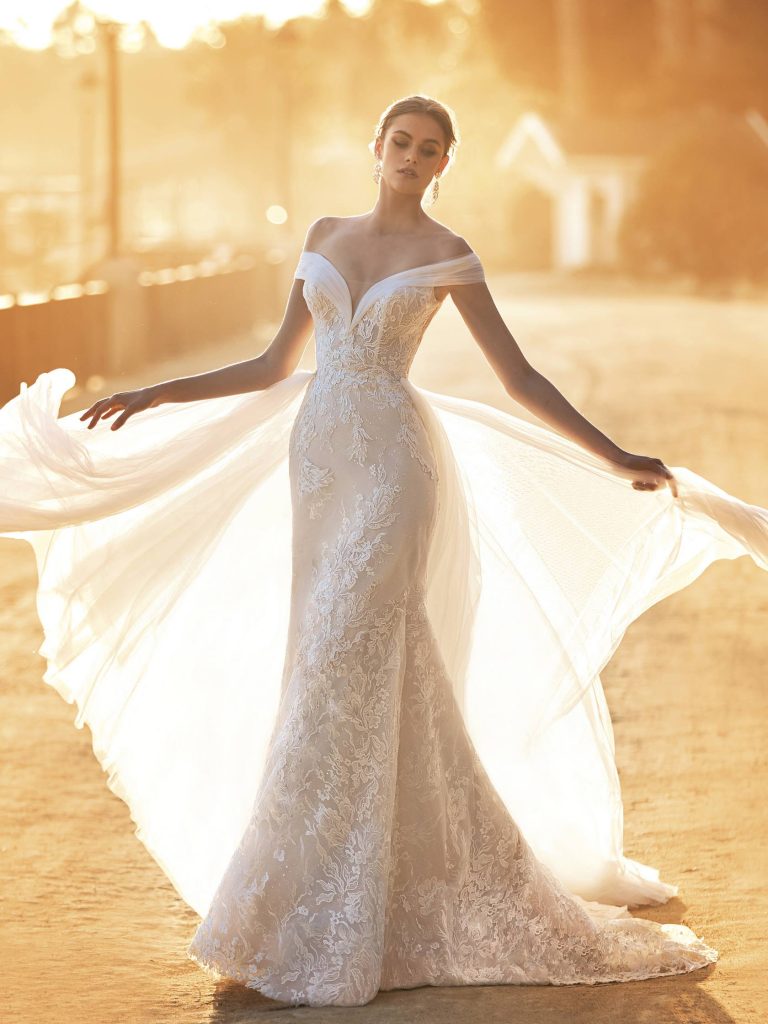 Abito da sposa decolte, stile sirena, scollatura spalle a v e tessuto pizzo