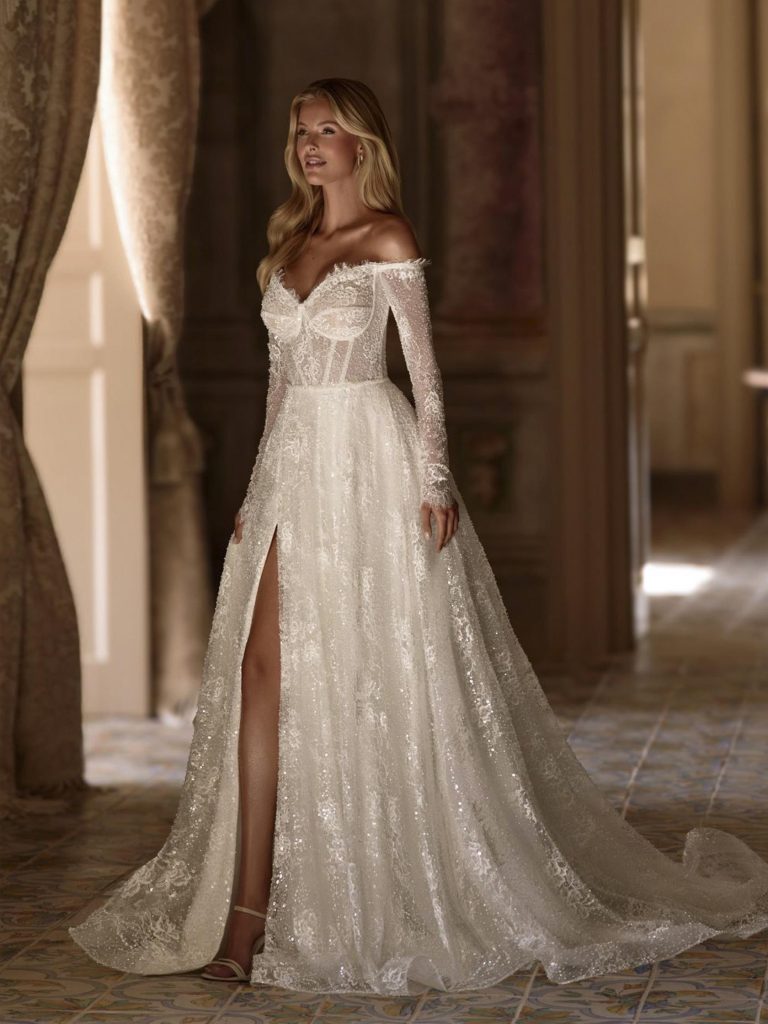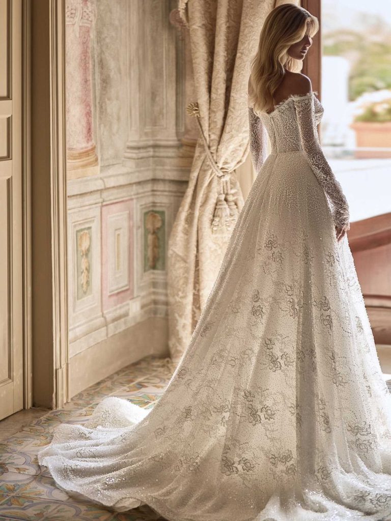 Abito da sposa maniche lunghe, stile principessa, scollatura spalle aperta e tessuto organza