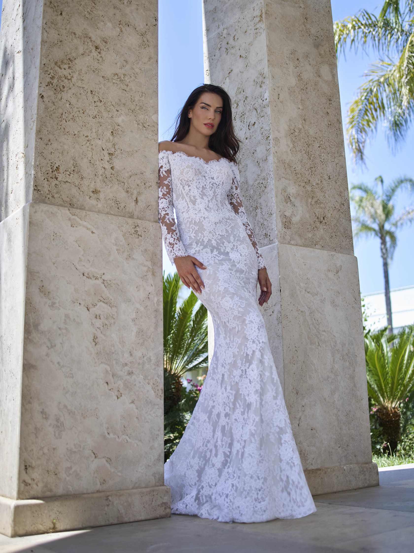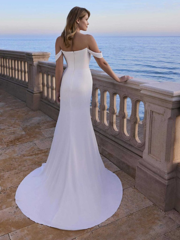 Abito da sposa manica decolte, stile sirena, scollatura spalle aperta e tessuto mikado