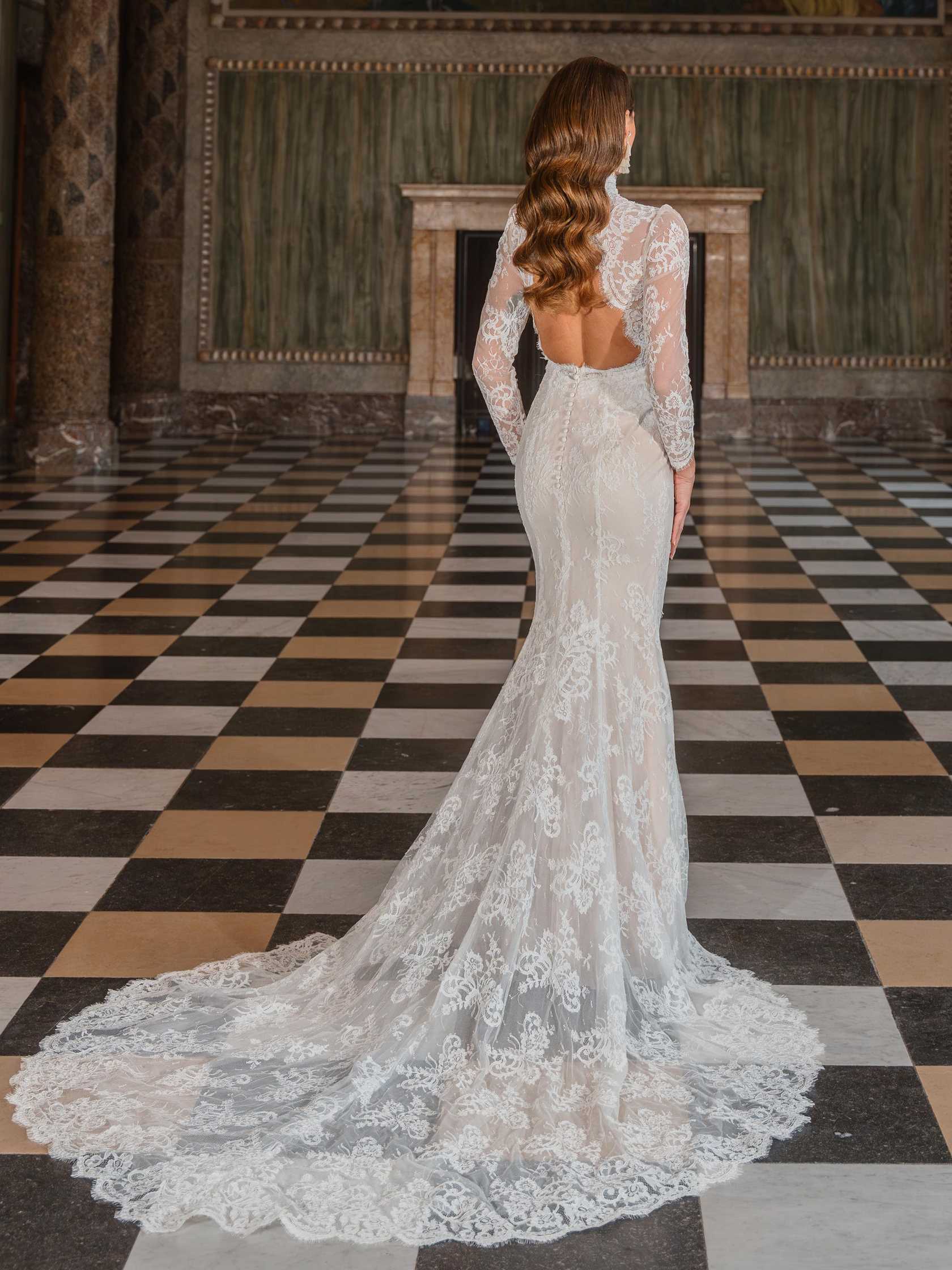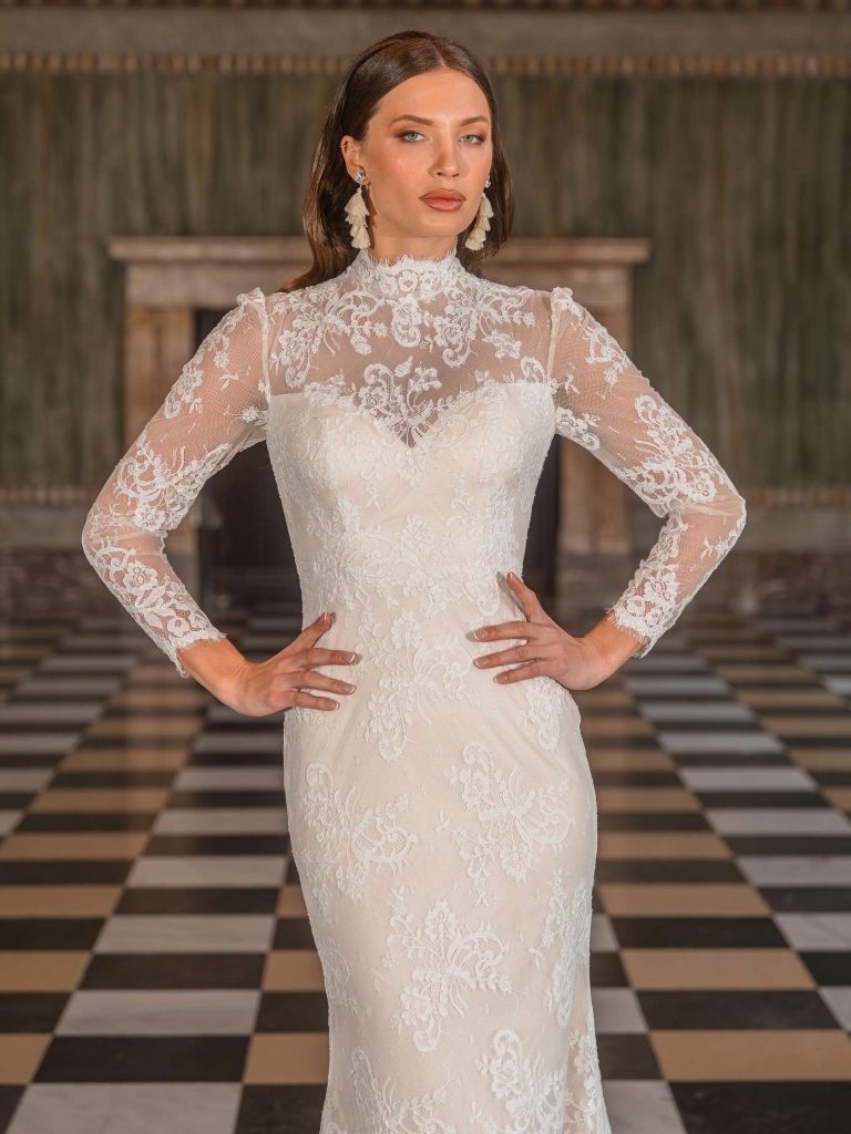 Abito da sposa maniche lunghe, stile sirena, scollatura spalle a goccia e tessuto organza