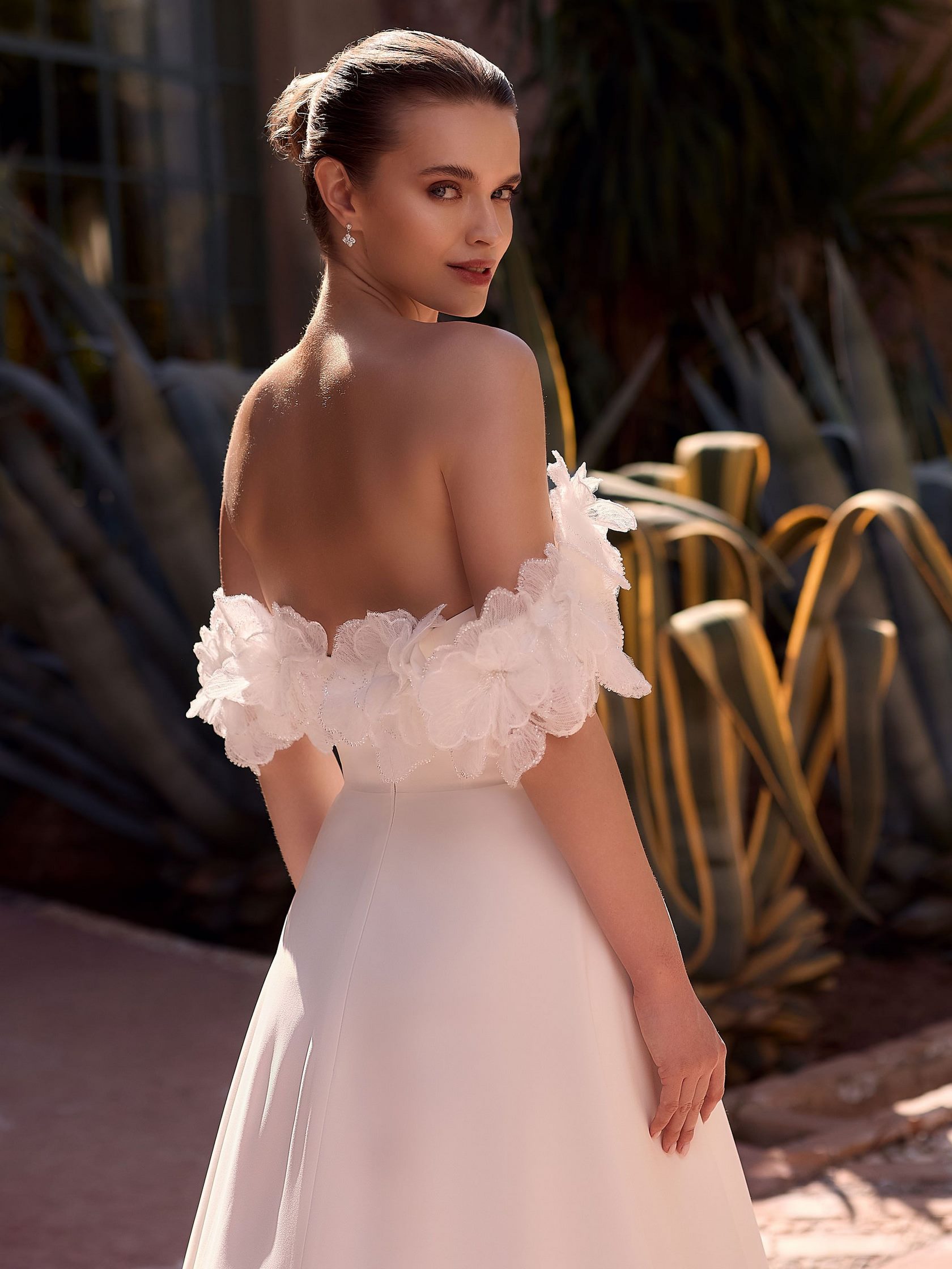 Abito da sposa manica decolte, stile scivolato, scollatura spalle aperta e tessuto organza