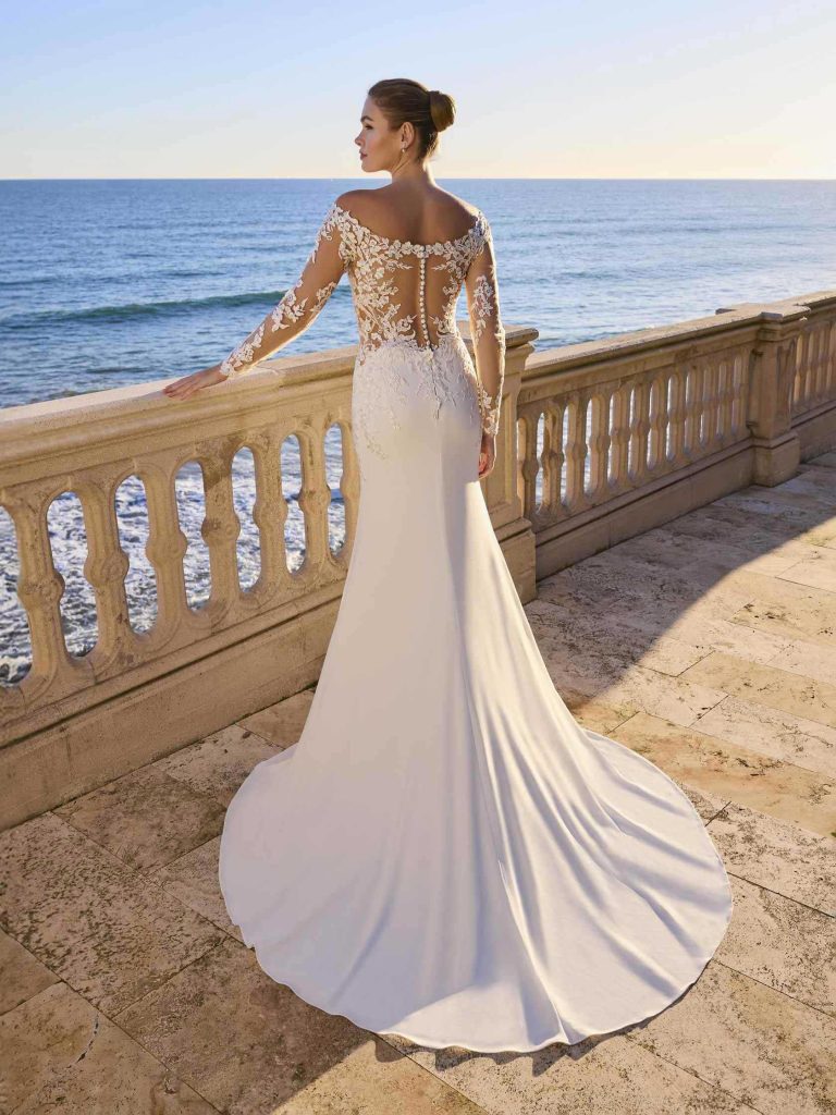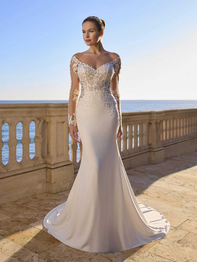 Abito da sposa maniche lunghe, stile sirena, scollatura spalle coperta e tessuto raso