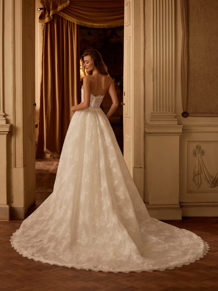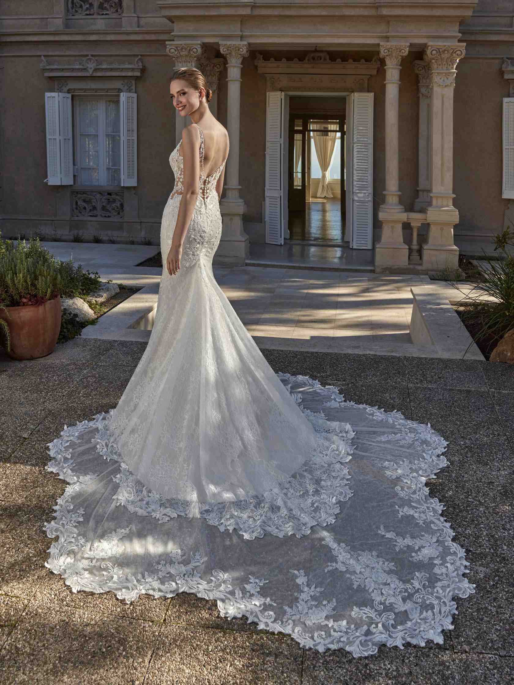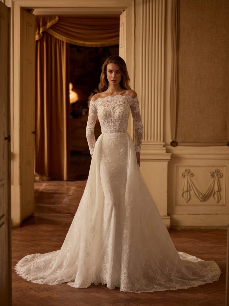 Abito da sposa maniche lunghe, stile sirena, scollatura spalle aperta e tessuto pizzo