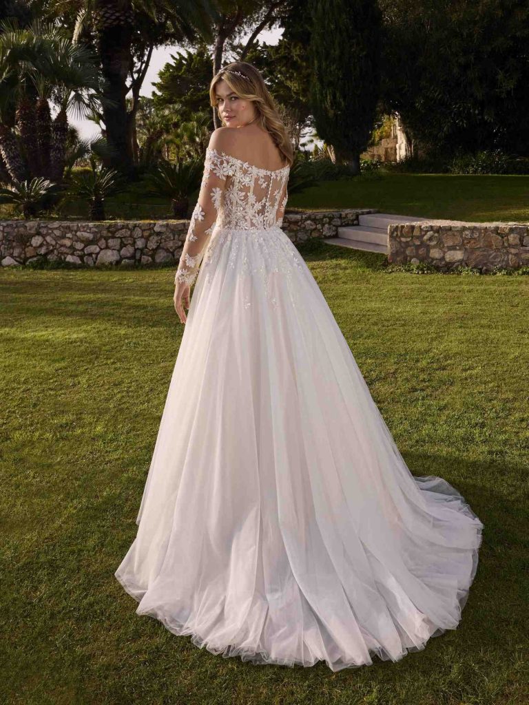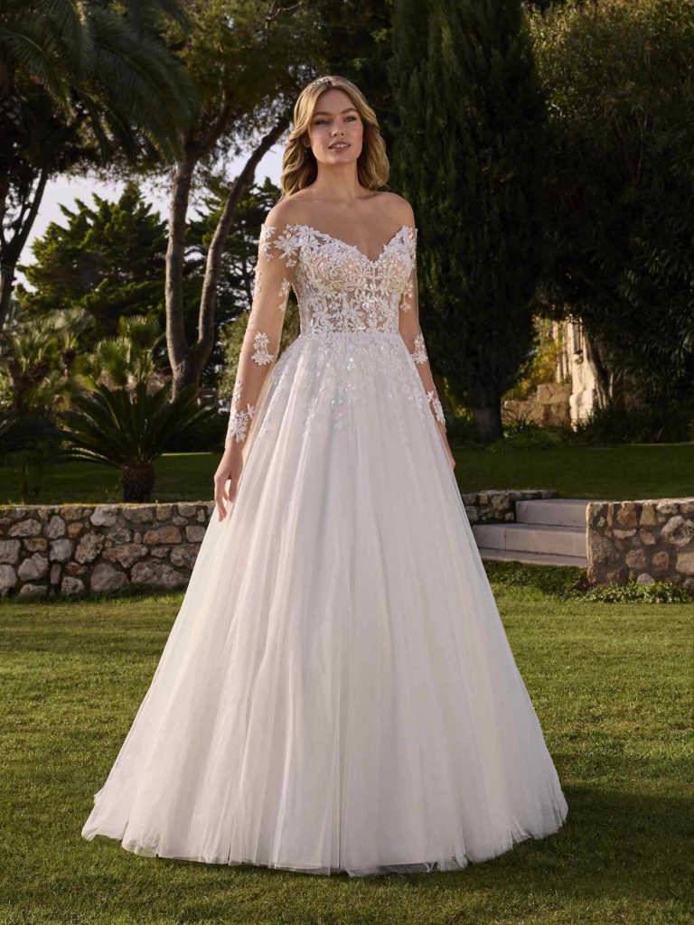 Abito da sposa manica decolte, stile principessa, scollatura spalle aperta e tessuto organza