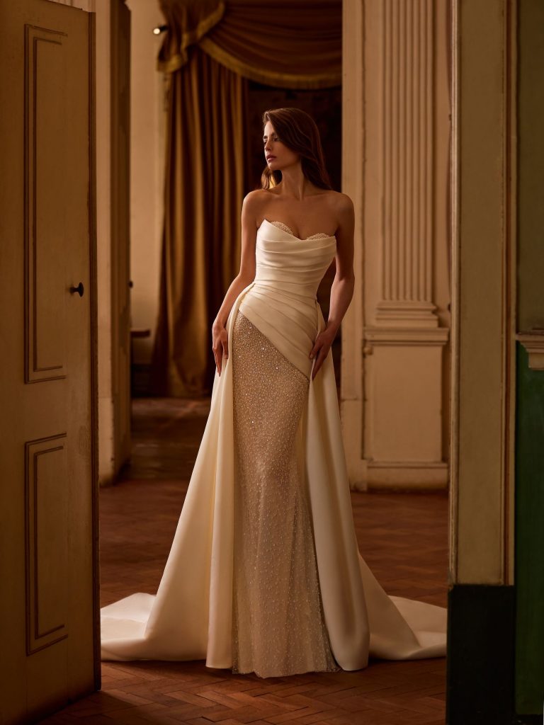 Abito da sposa manica decolte, stile sirena, scollatura spalle aperta e tessuto mikado