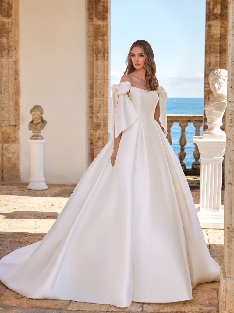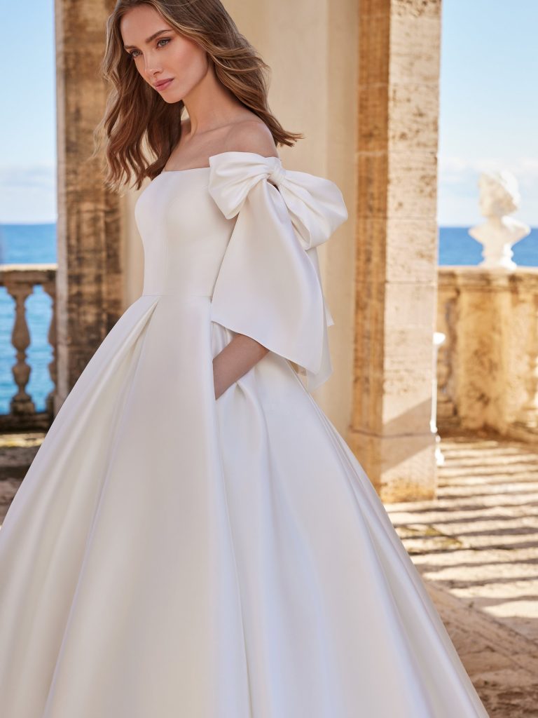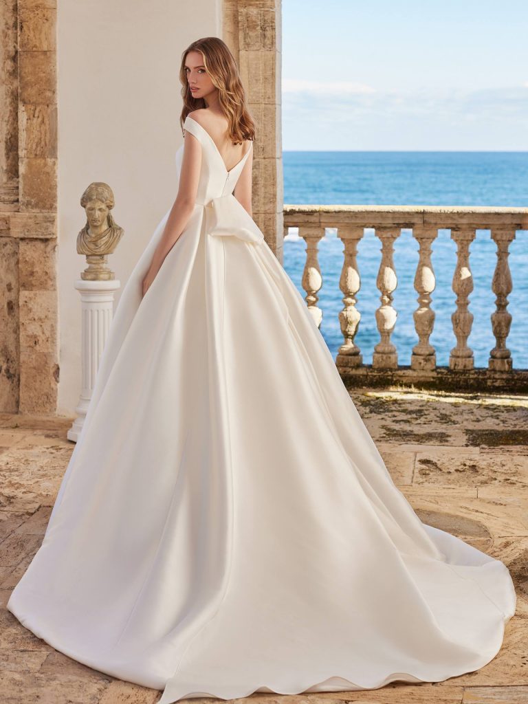 Abito da sposa decolte, stile semplice, scollatura spalle coperta e tessuto mikado