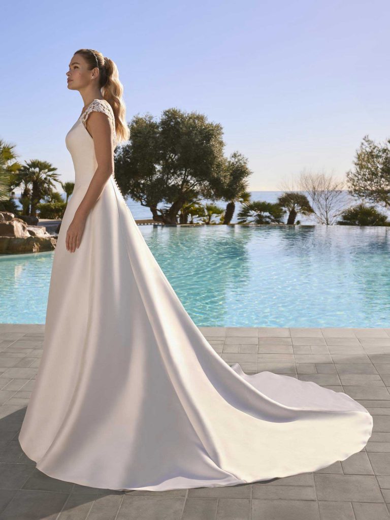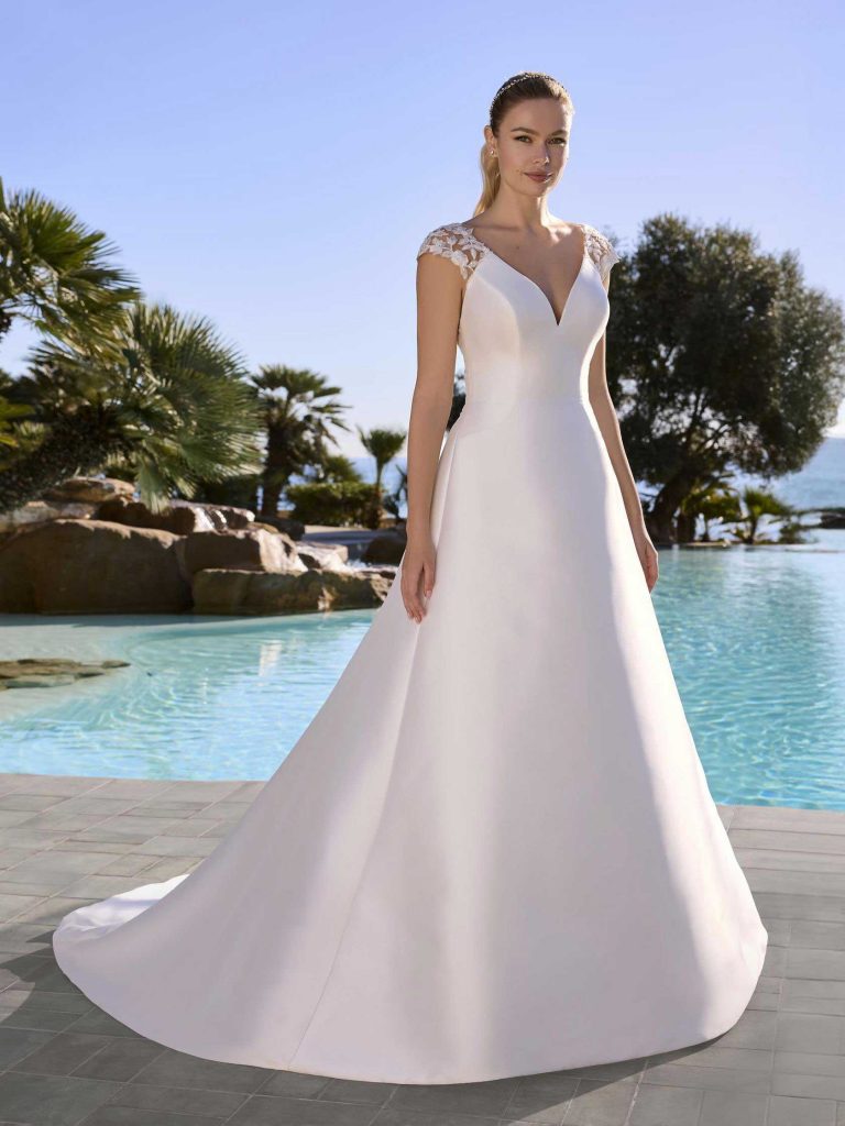 Abito da sposa maniche corte, stile semplice, scollatura spalle a v e tessuto mikado