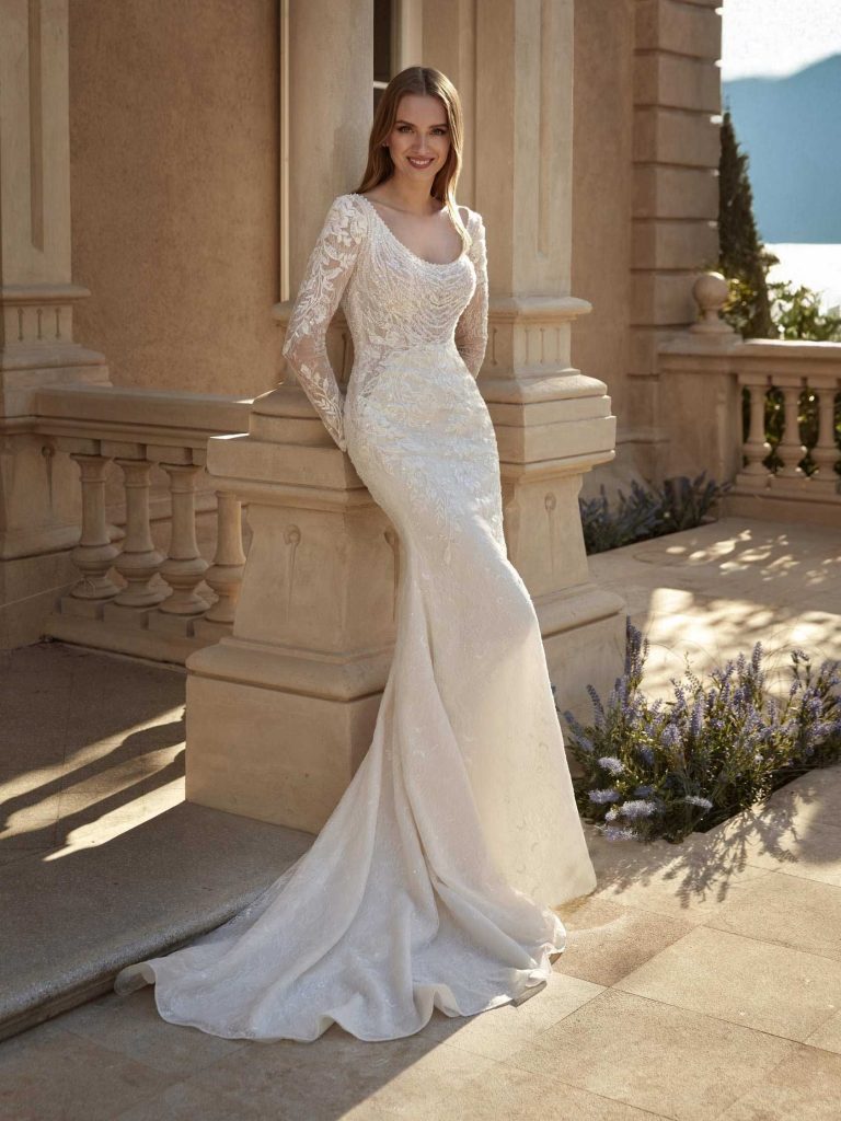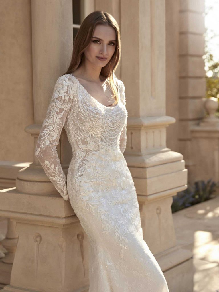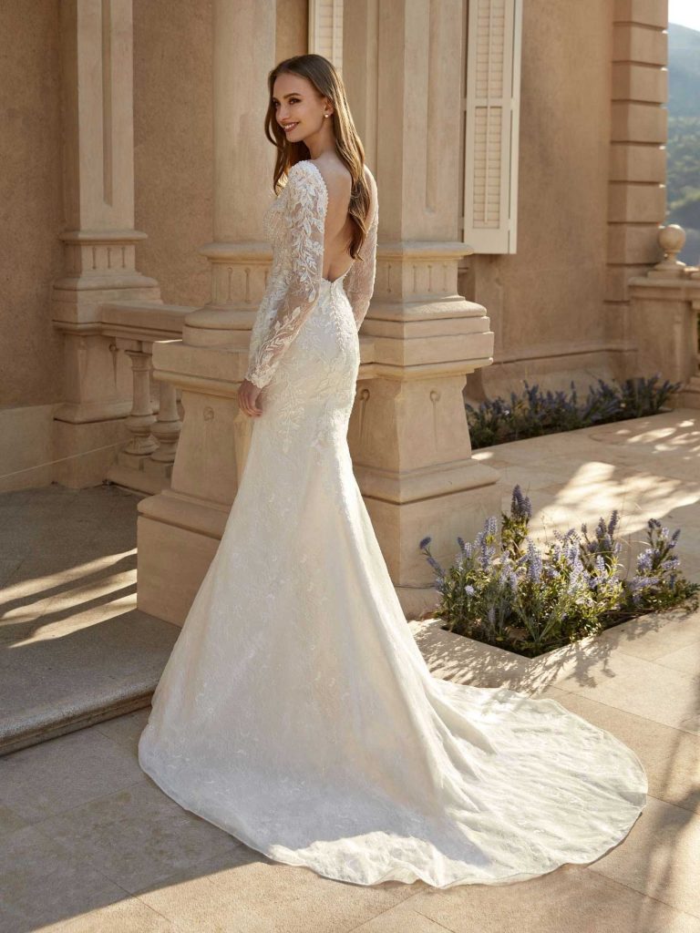 Abito da sposa maniche lunghe, stile sirena, scollatura spalle a v e tessuto pizzo