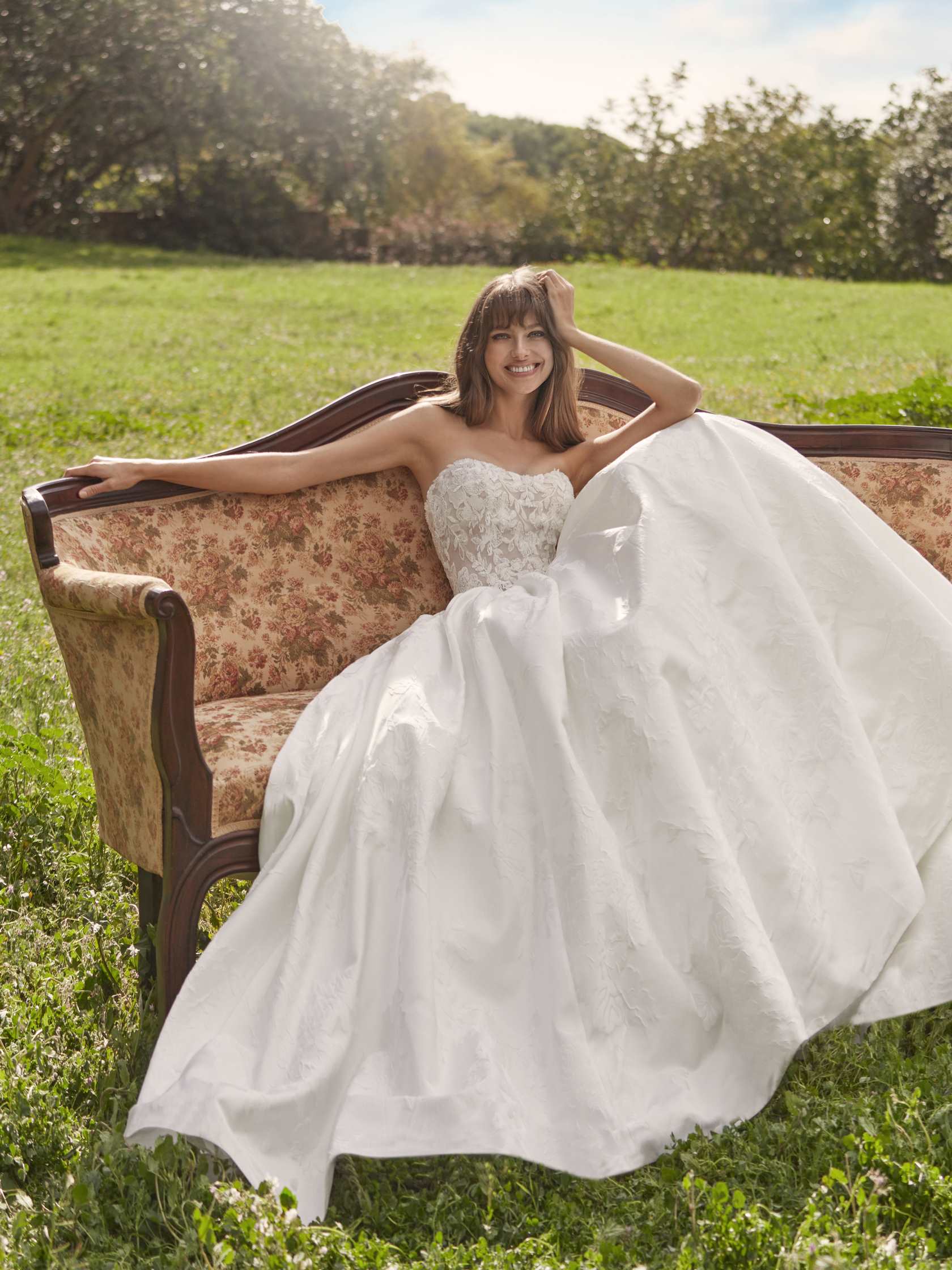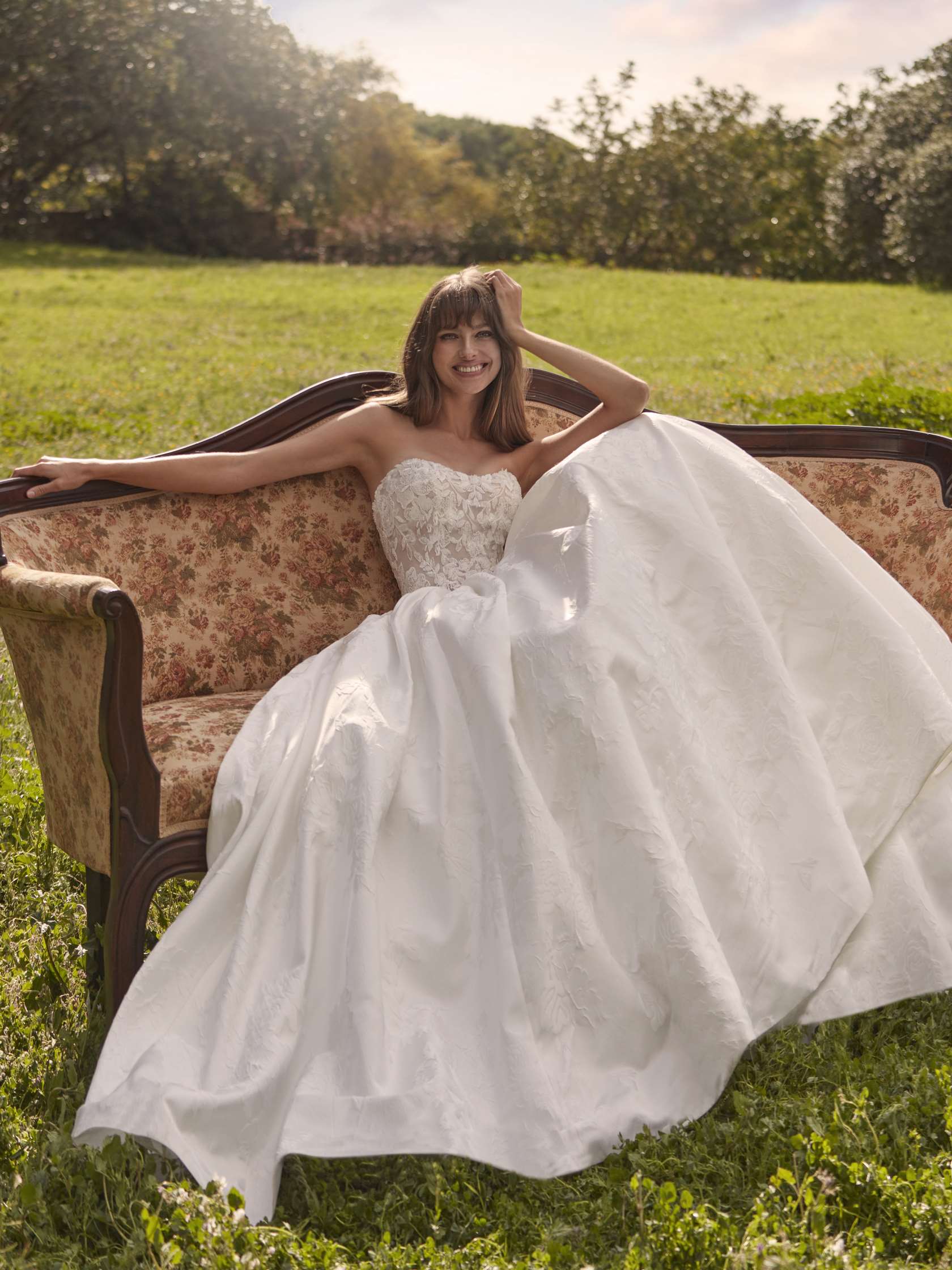 Abito da sposa manica decolte, stile principessa, scollatura spalle aperta e tessuto mikado