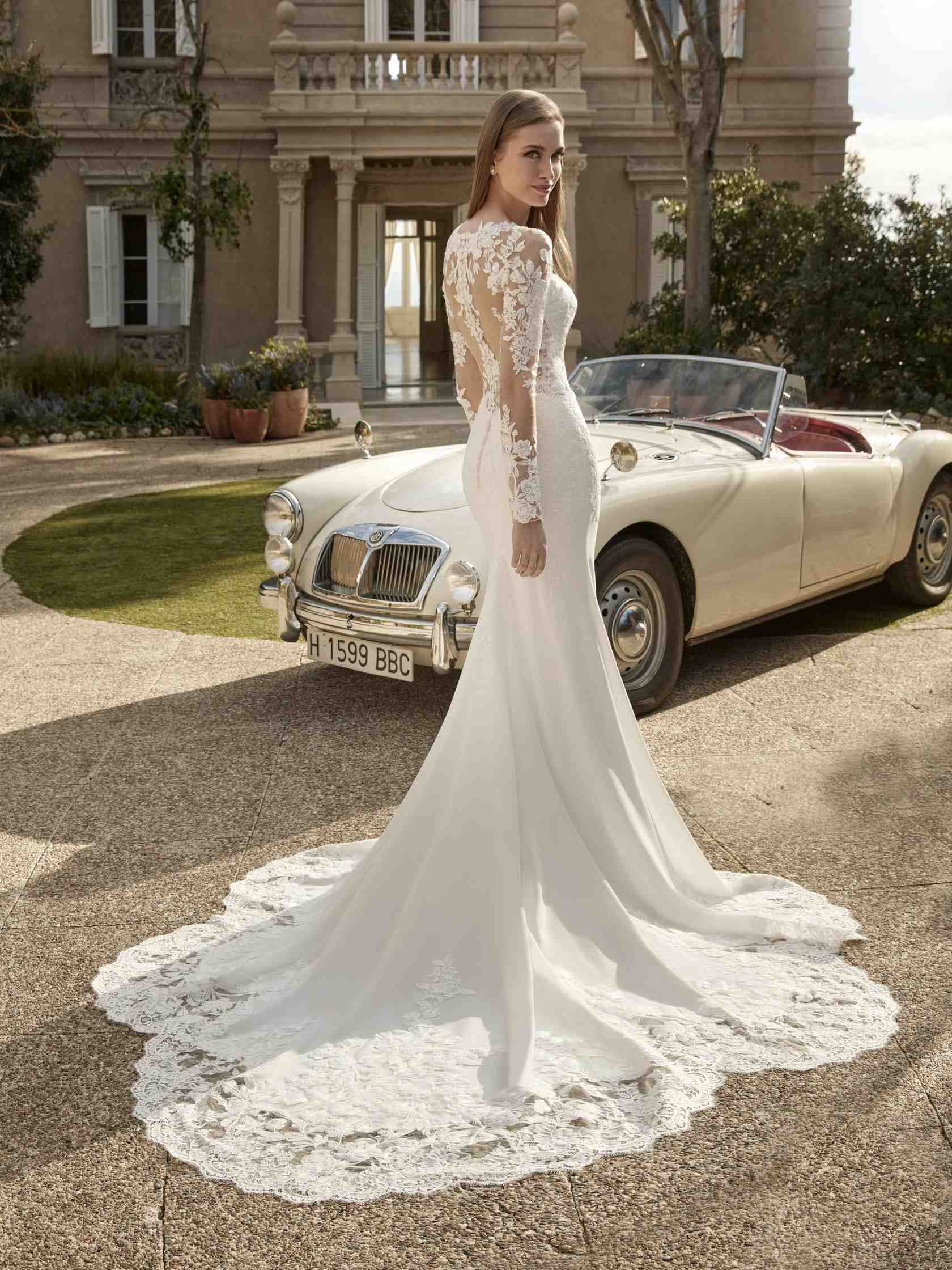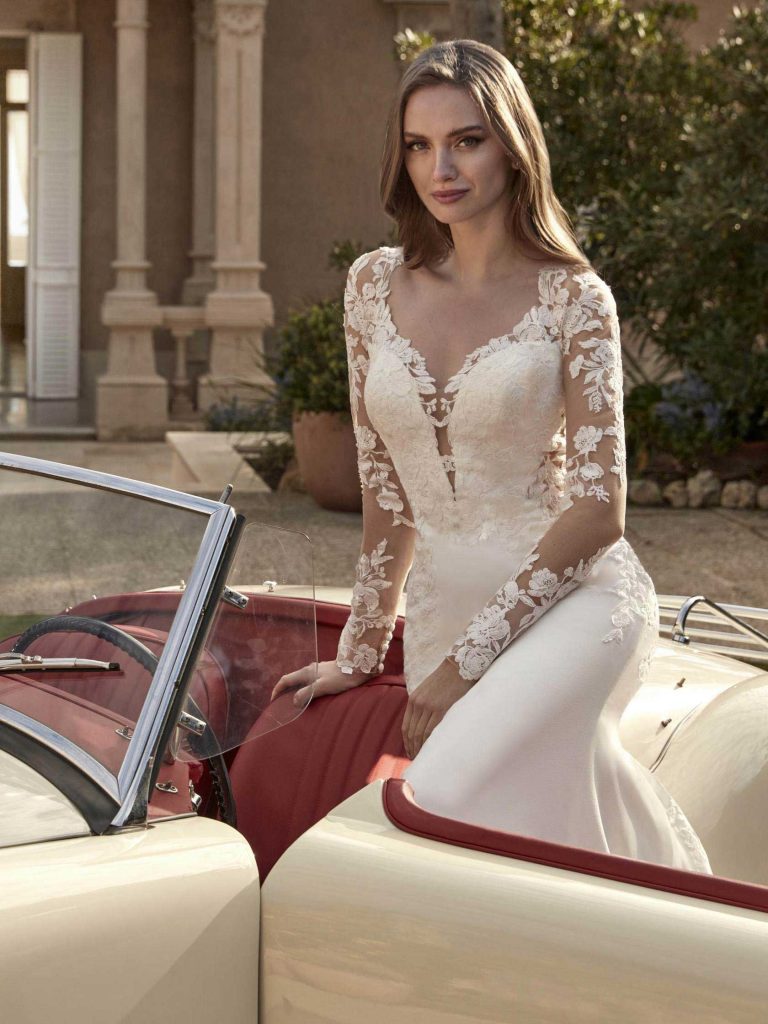 Abito da sposa maniche lunghe, stile sirena, scollatura spalle coperta e tessuto satin