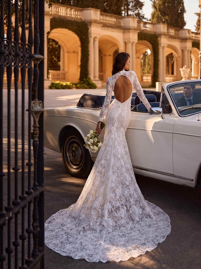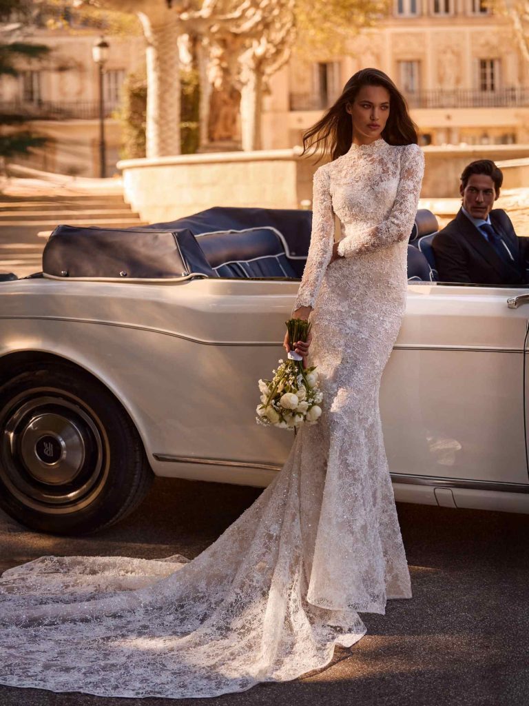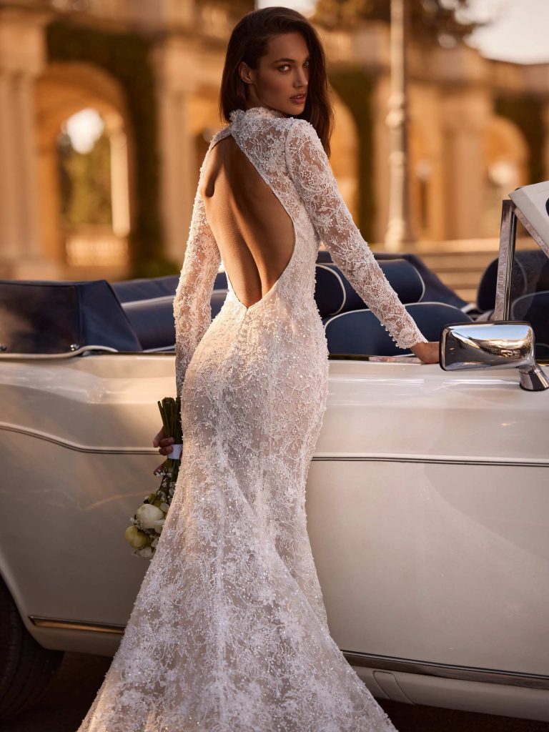 Abito da sposa maniche lunghe, stile sirena, scollatura spalle a goccia e tessuto pizzo