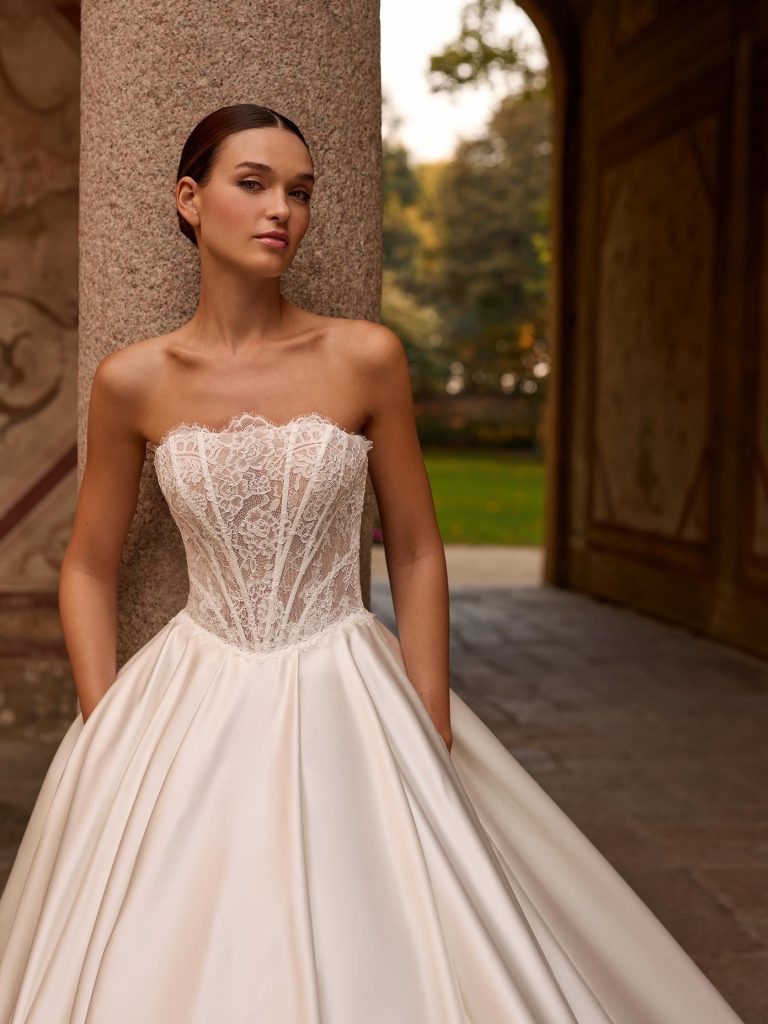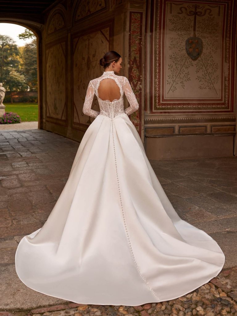 Abito da sposa maniche lunghe, stile semplice, scollatura spalle a goccia e tessuto mikado