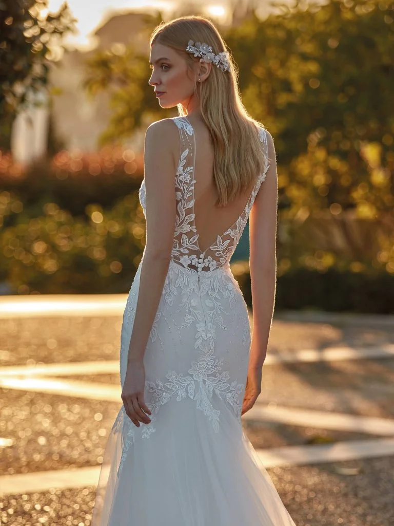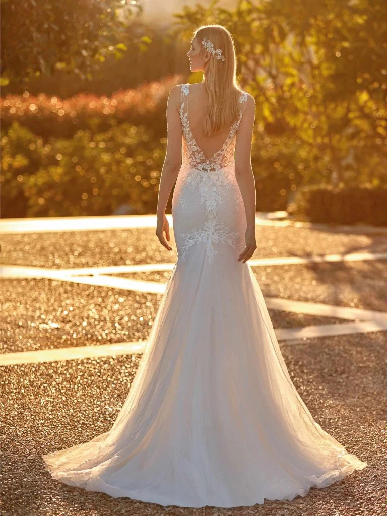 Abito da sposa canotta, stile sirena, scollatura spalle a v e tessuto seta