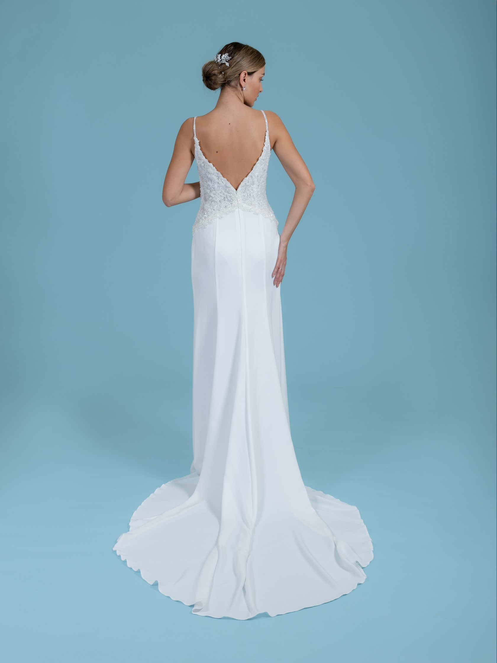 Abito da sposa bretelle, stile sirena, scollatura spalle a v e tessuto seta