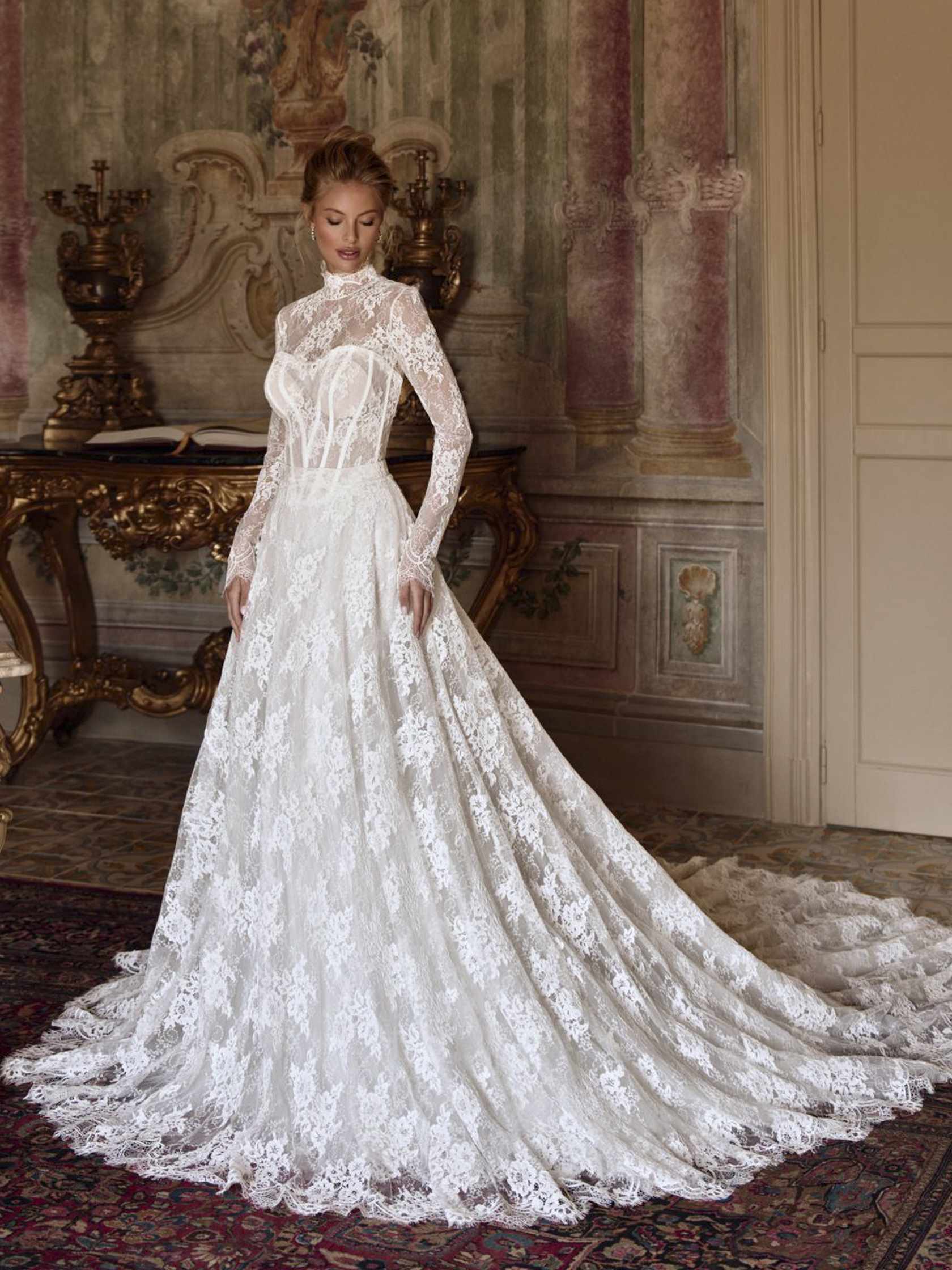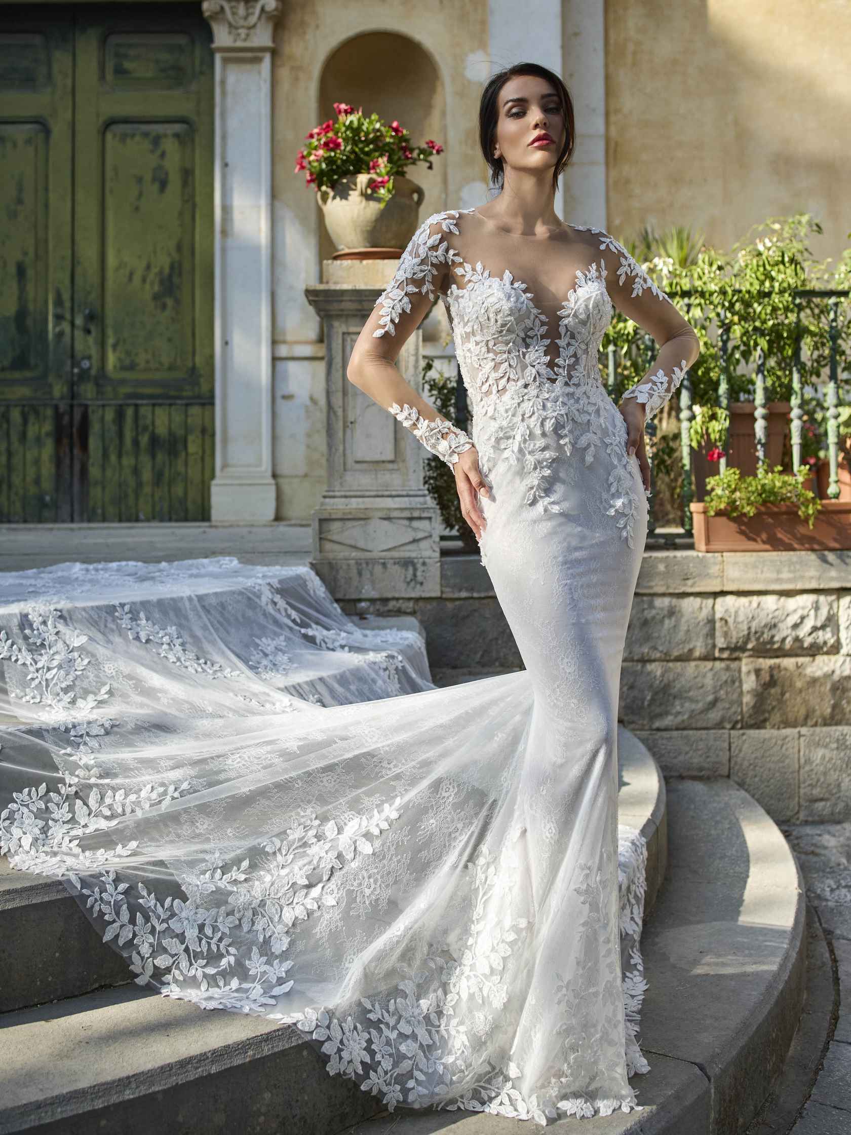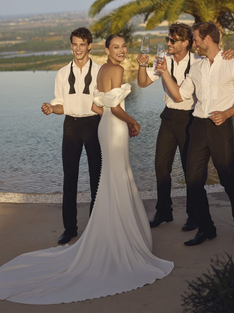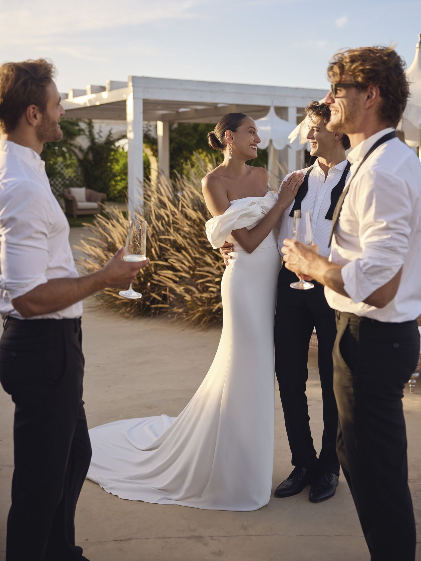 Abito da sposa manica decolte, stile sirena, scollatura spalle aperta e tessuto raso