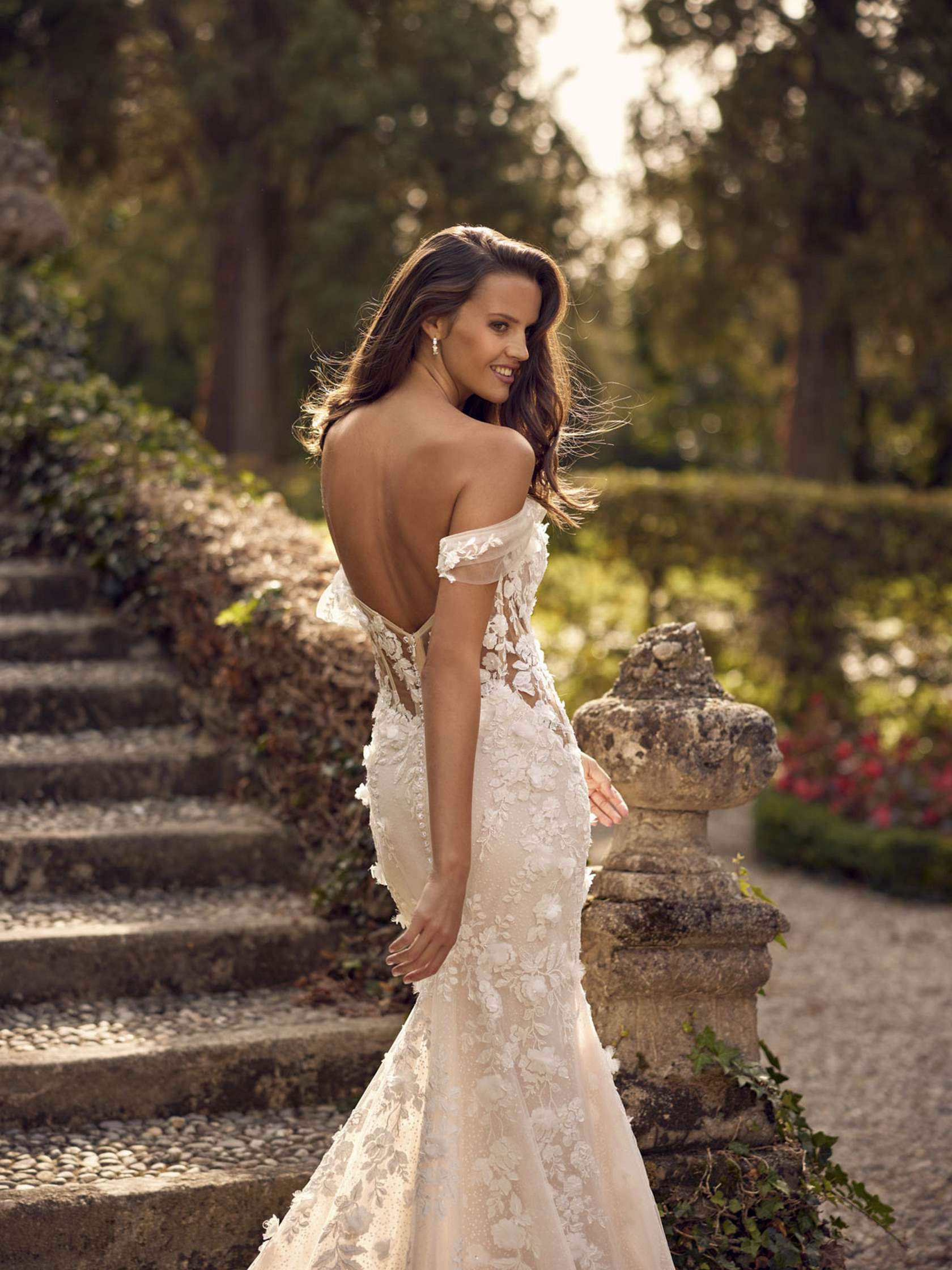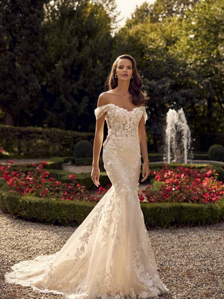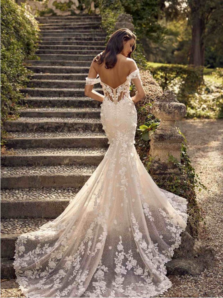 Abito da sposa manica decolte, stile sirena, scollatura spalle aperta e tessuto pizzo