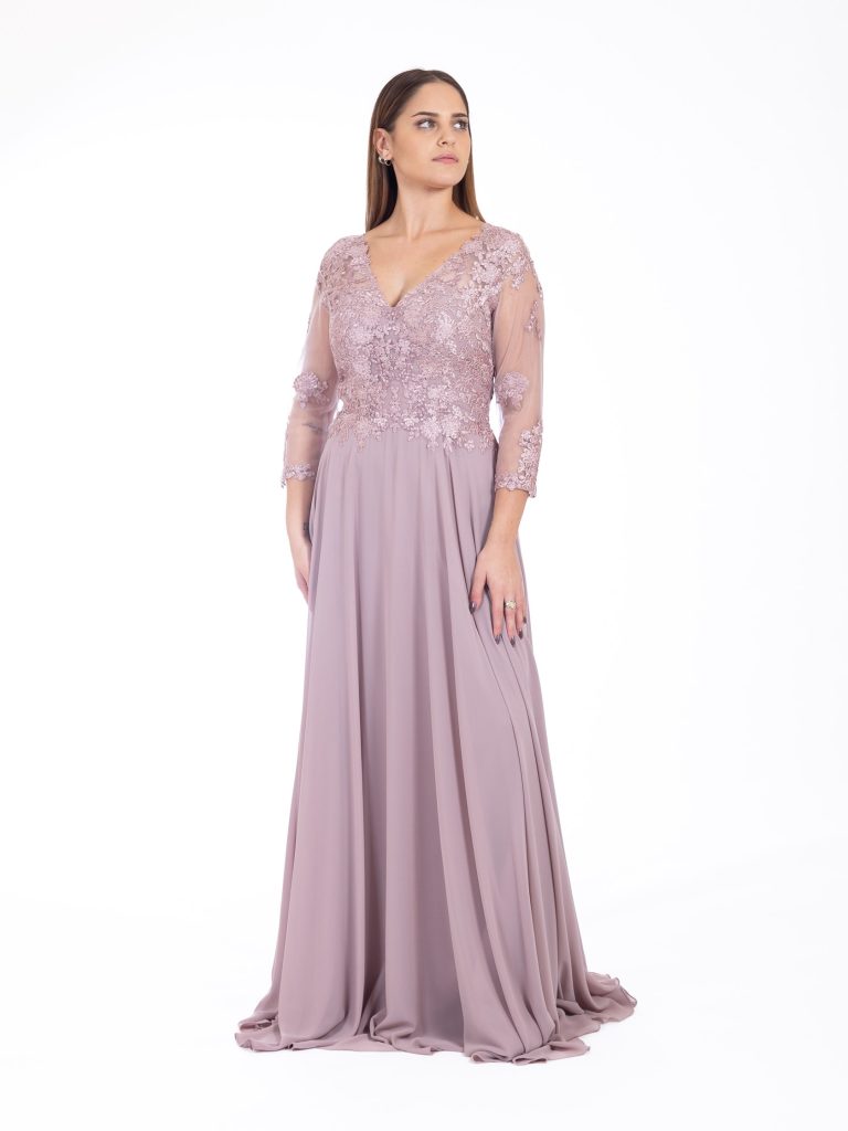 Abito lungo da cerimonia in tessuto georgette e pizzo