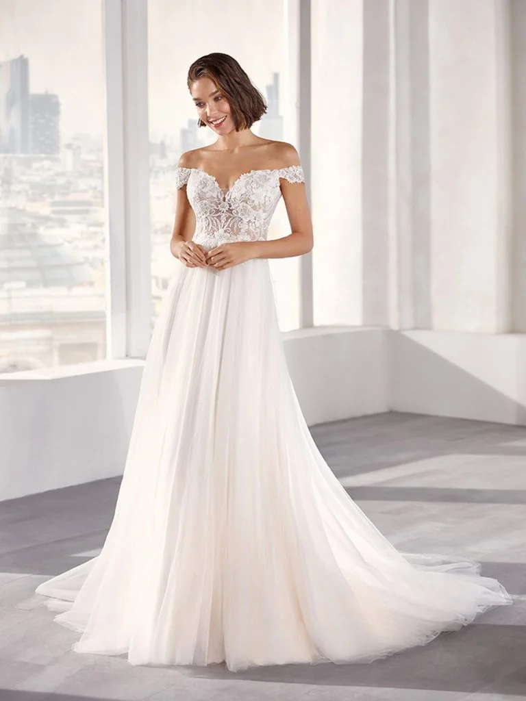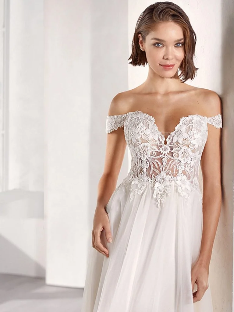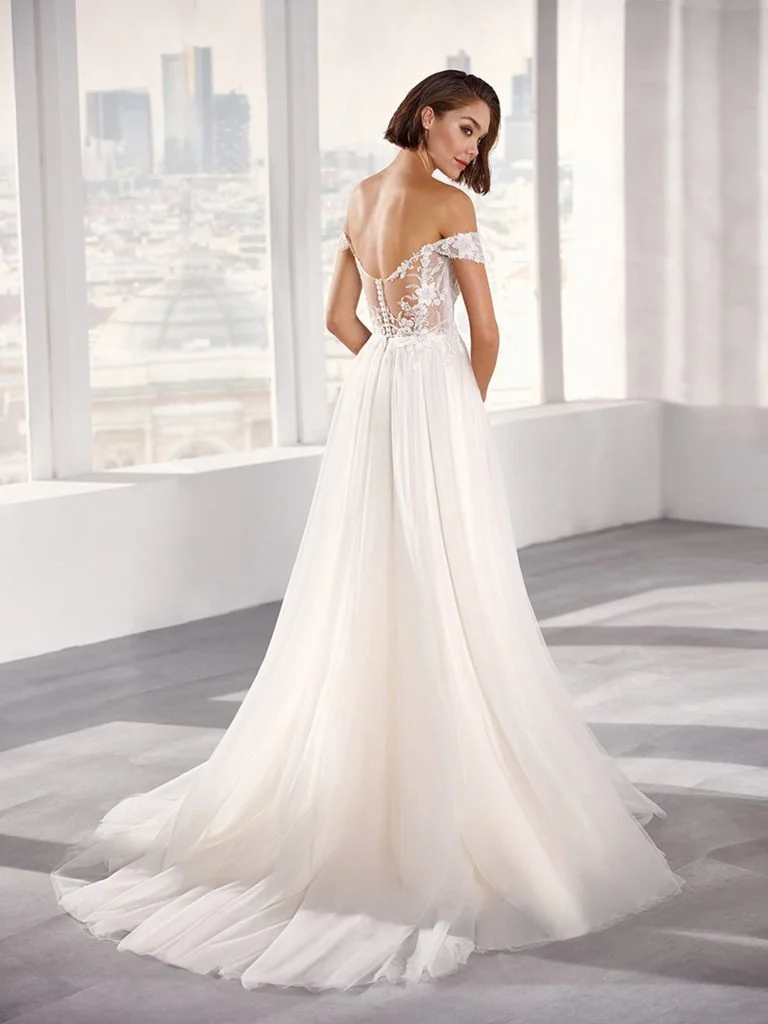 Abito da sposa decolte, stile scivolato, scollatura spalle aperta e tessuto organza