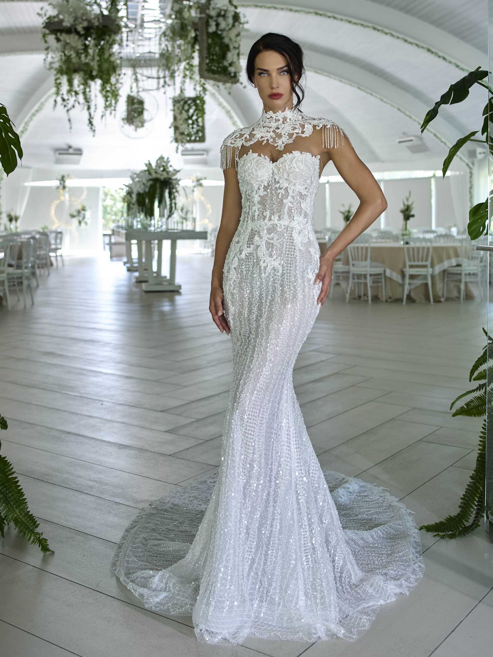 Abito da sposa manica decolte, stile sirena, scollatura spalle aperta e tessuto mikado