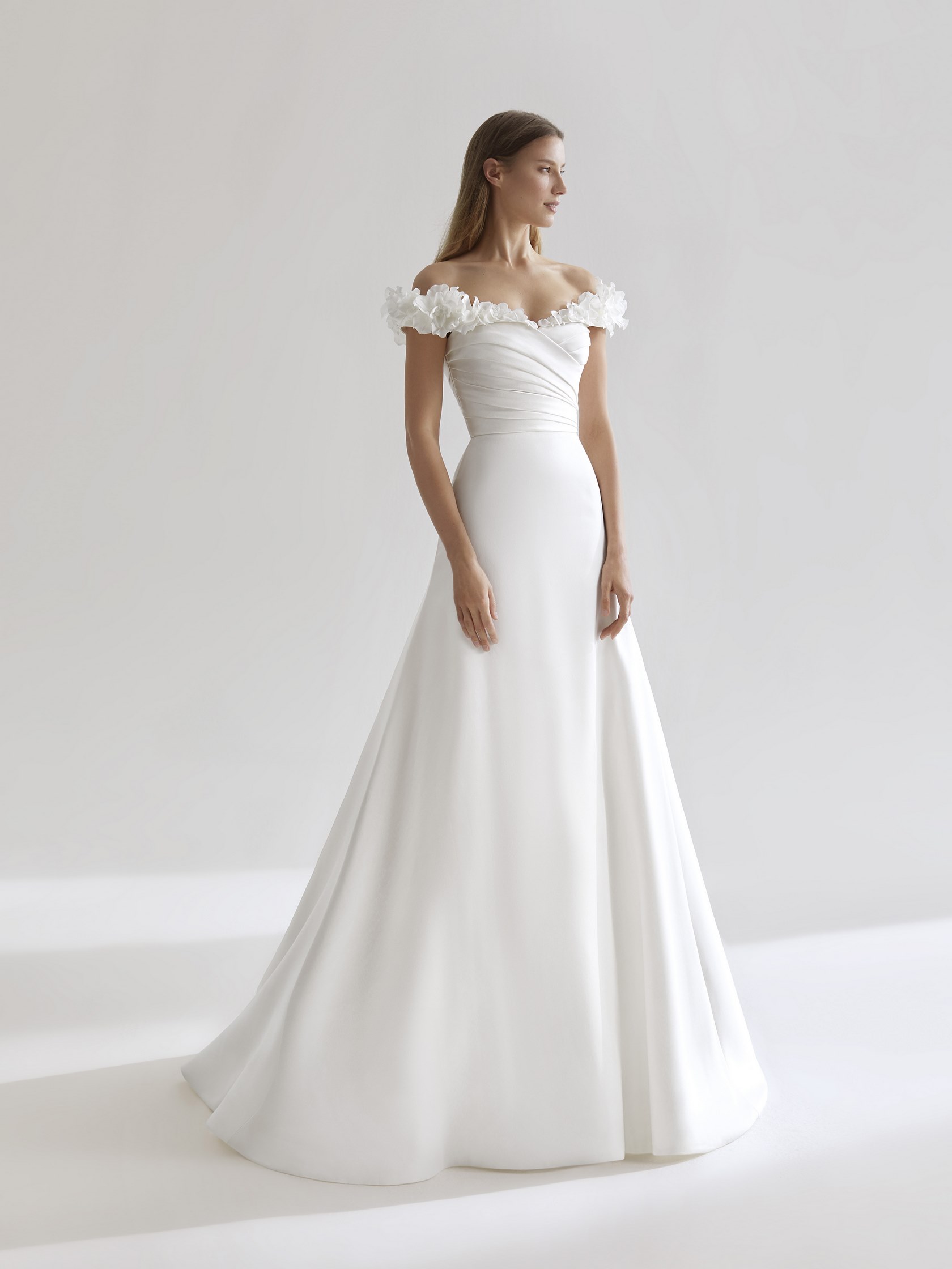 Abito da sposa decolte, stile semplice, scollatura spalle aperta e tessuto organza