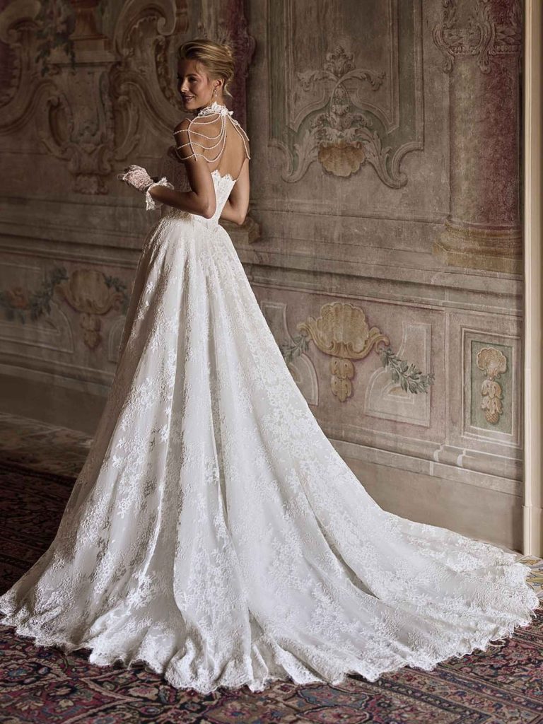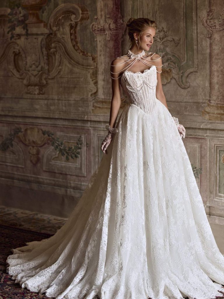 Abito da sposa manica decolte, stile principessa, scollatura spalle aperta e tessuto organza