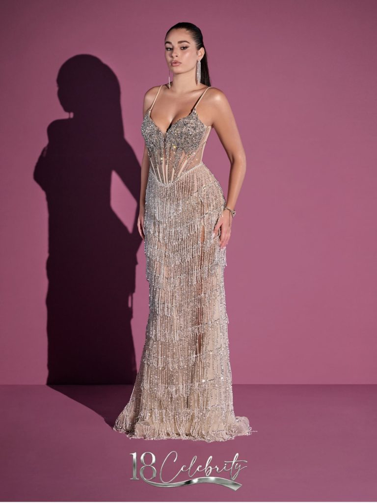 Abito lungo da cerimonia in tessuto organza e paillettes