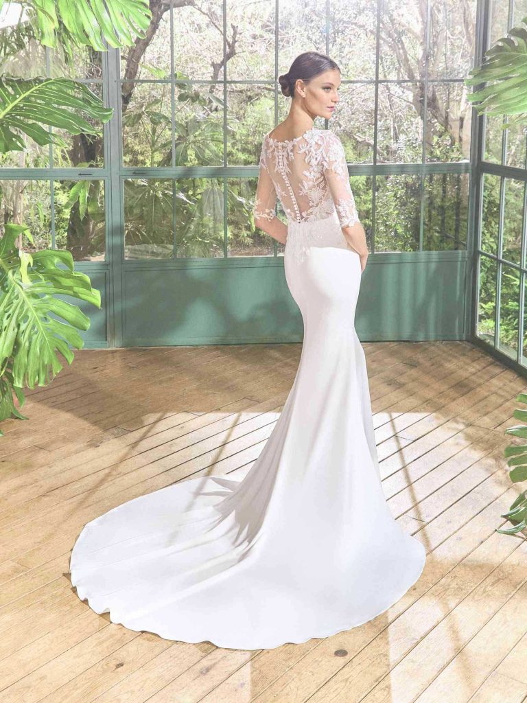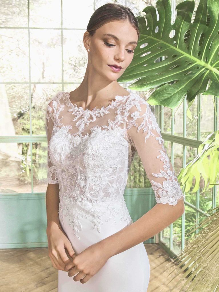 Abito da sposa manica tre quarti, stile sirena, scollatura spalle coperta e tessuto satin