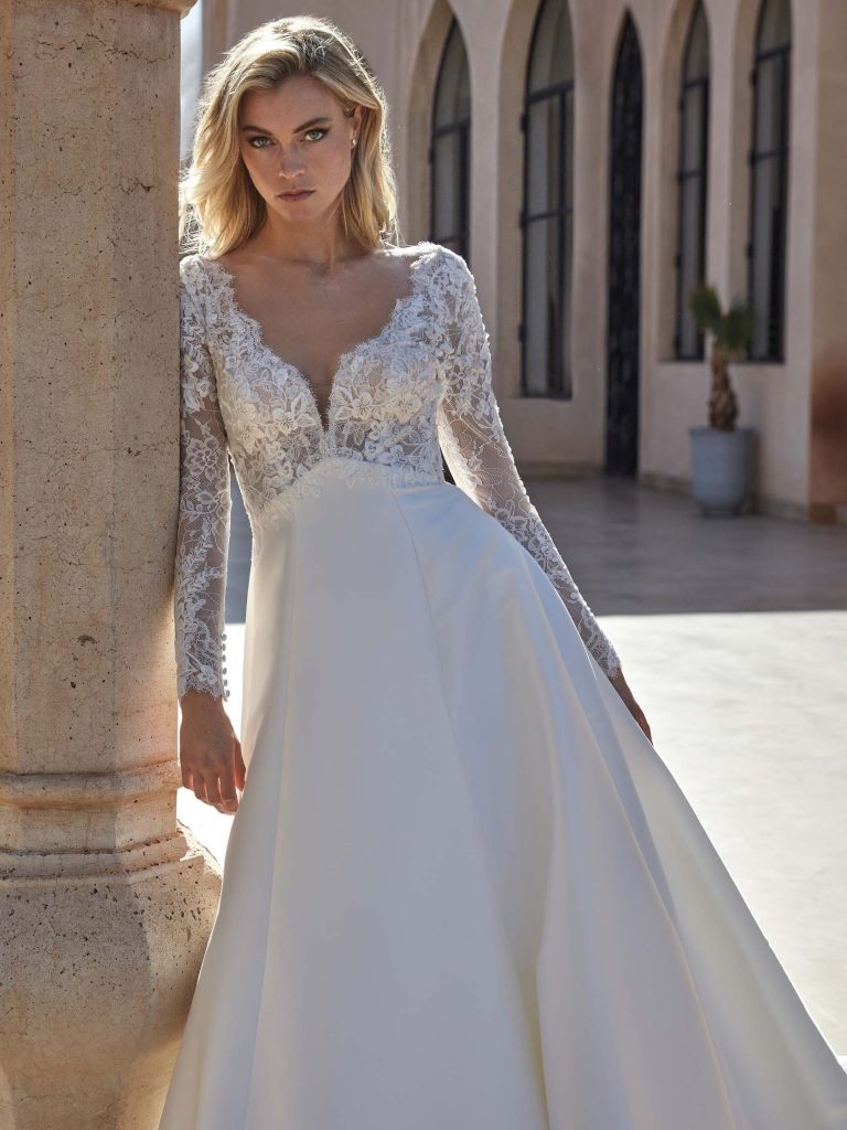 Abito da sposa maniche lunghe, stile romantico, scollatura spalle aperta e tessuto mikado