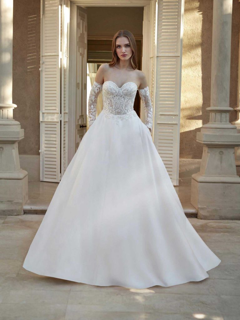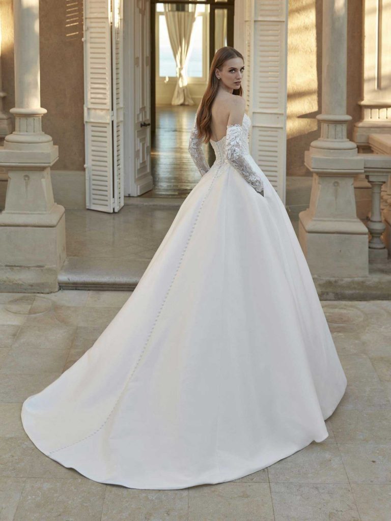 Abito da sposa manica decolte, stile semplice, scollatura spalle aperta e tessuto mikado