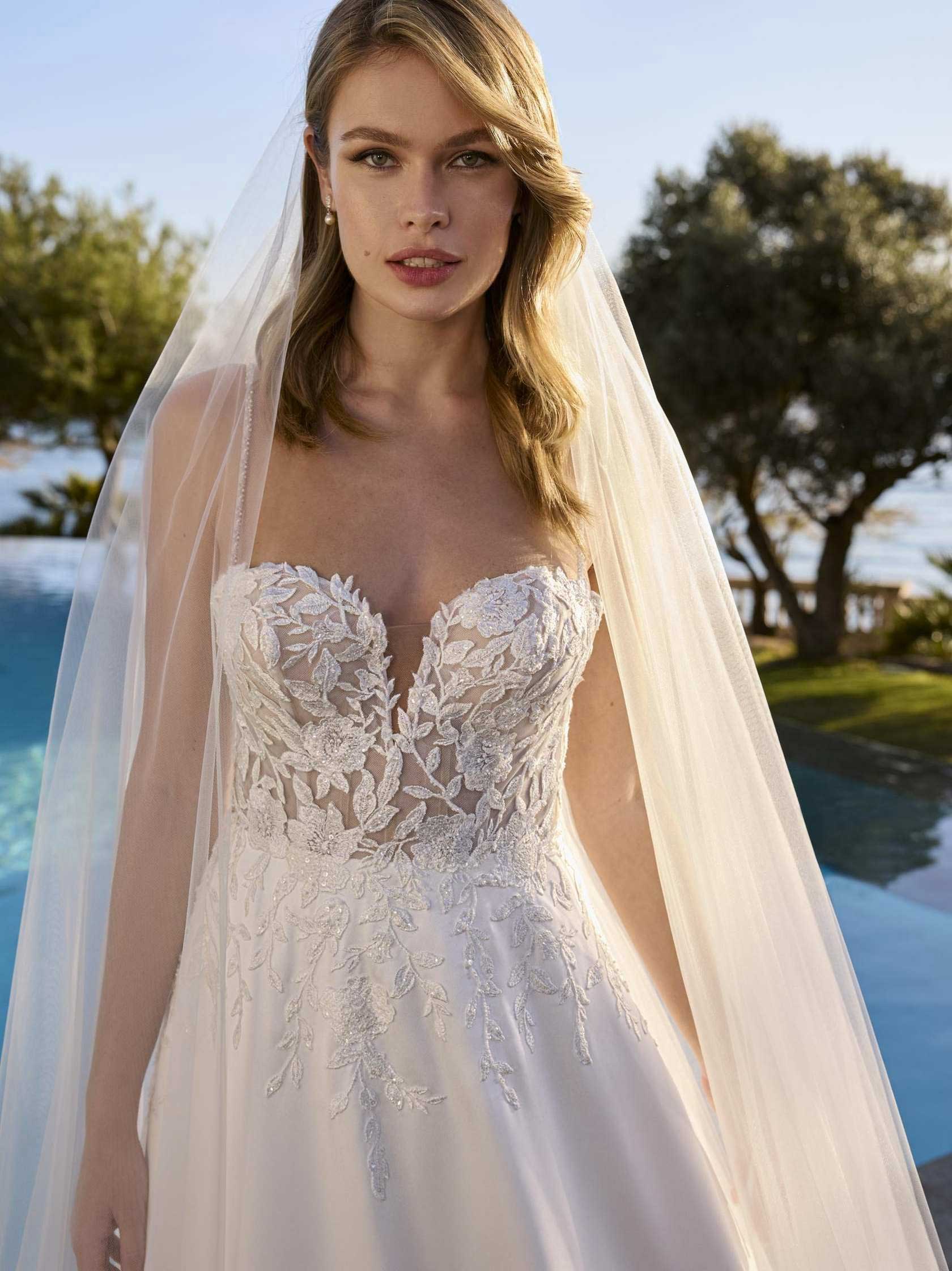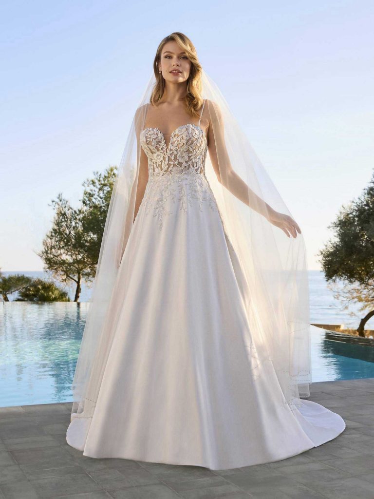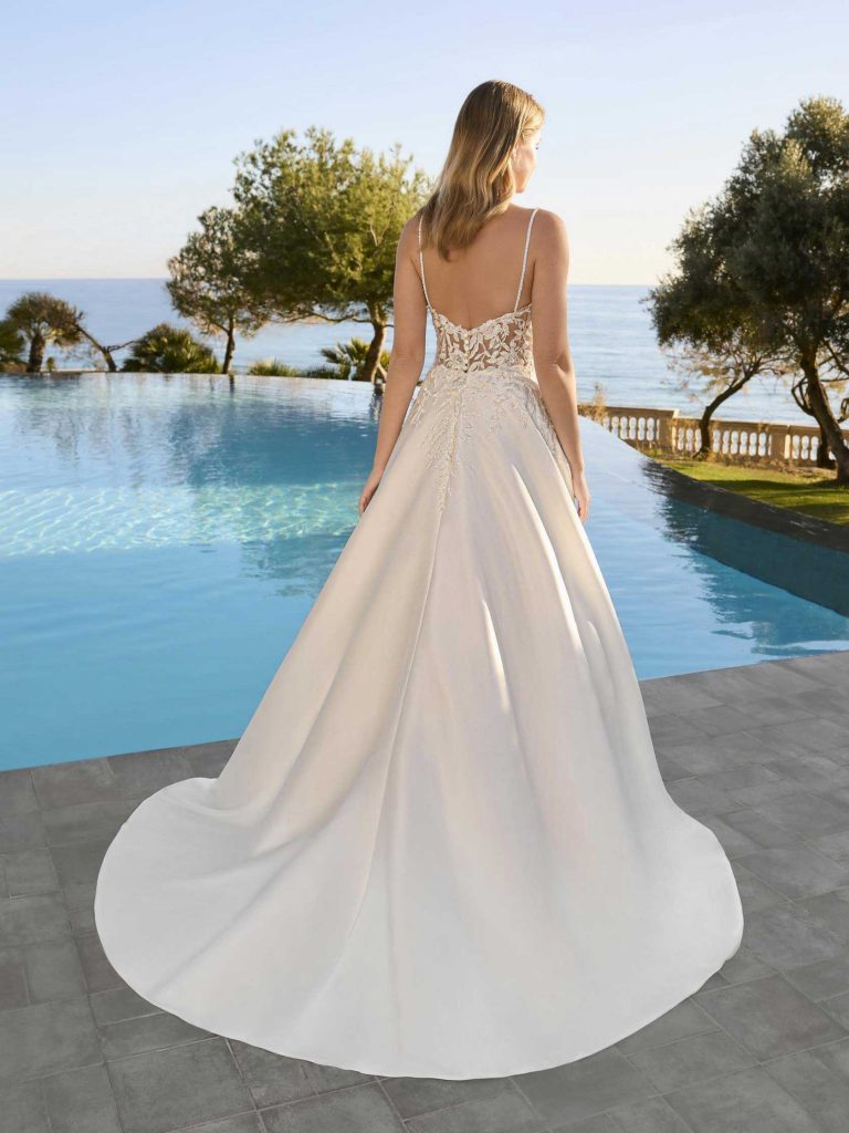 Abito da sposa manica decolte, stile semplice, scollatura spalle aperta e tessuto raso