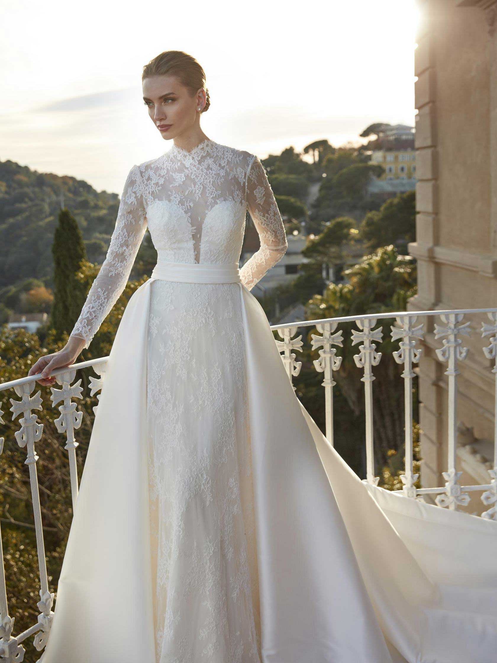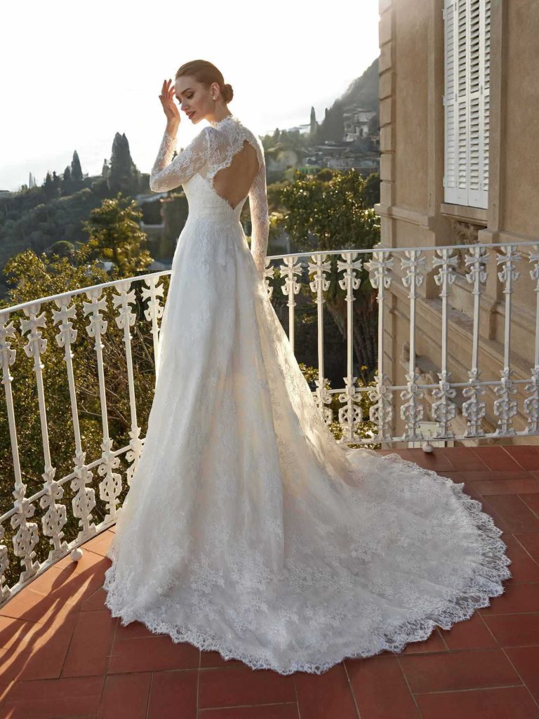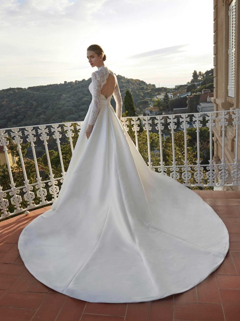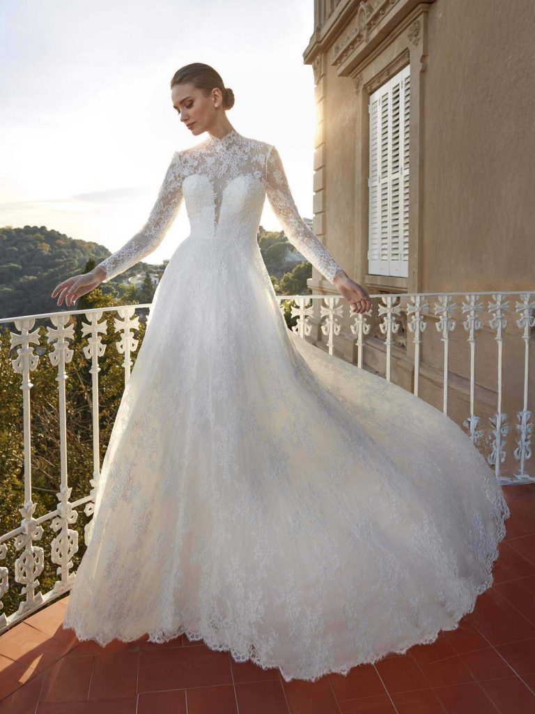 Abito da sposa maniche lunghe, stile principessa, scollatura spalle a goccia e tessuto organza